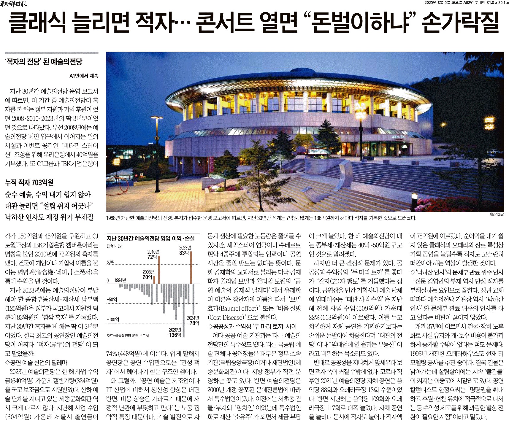 왜 그럴까. ‘공연 예술은 제조업이나 IT 산업에 비해서 생산성 향상은 더딘 반면, 비용 상승은 가파르기 때문에 재정적 난관에 부딪히고 만다’는 노동 집약적 특징 때문이다.
