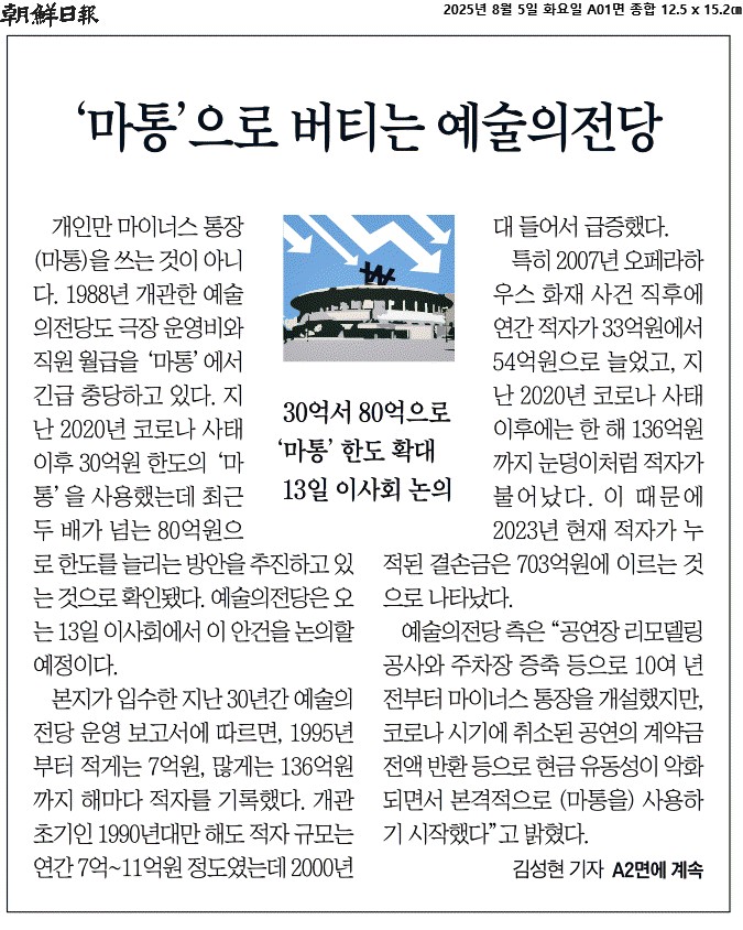 ① 1988년 개관한 예술의전당도 극장 운영비와 직원 월급을 ‘마통’에서 긴급 충당하고 있다. 지난 2020년 코로나 사태 이후 30억원 한도의 ‘마통’을 사용했는데 최근 두 배가 넘는 80억원으로 한도를 늘리는 방안을 추진하고 있는 것으로 확인됐다.