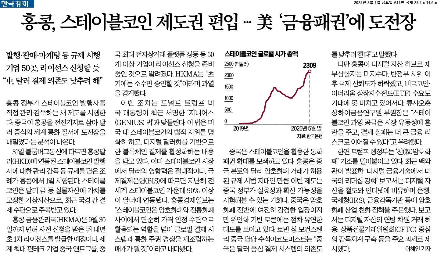 ① 홍콩 정부가 스테이블코인 발행사를 직접 관리·감독하는 새 제도를 시행한다. 중국이 홍콩을 전진기지로 삼아 달러 중심의 세계 통화 질서에 도전장을 내밀었다는 분석이 나온다.