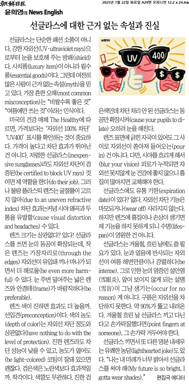 ① 선글라스는 단순한 패션 소품이 아니다. 강한 자외선(UV·ultraviolet rays)으로부터 눈을 보호해 주는 방패(shield)다. 사치품(luxury item)이 아니라 필수품(essential goods)이다. 그런데 여전히 많은 사람이 근거 없는 속설(myth)을 믿고 있다. 가장 흔한 오해(most common misconception)는 “비쌀수록 좋은 것” “여름에만 쓰는 것”이라는 인식이다.