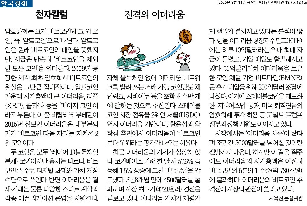 ④ 최근 이더리움의 기세가 심상치 않다. 코인베이스 기준 한 달 새 57.6% 급등해 1.5% 상승에 그친 비트코인을 압도했다. 3년8개월 만에 4500달러를 돌파하며 사상 최고가(4721달러) 경신을 넘보고 있다. 이더리움 가치가 재평가돼 랠리가 펼쳐지고 있다는 분석이 많다.