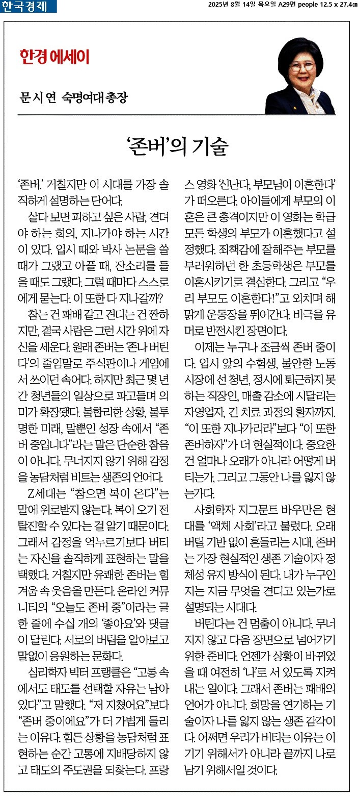 ③ 심리학자 빅터 프랭클은 “고통 속에서도 태도를 선택할 자유는 남아 있다”고 말했다. “저 지쳤어요”보다 “존버 중이에요”가 더 가볍게 들리는 이유다. 힘든 상황을 농담처럼 표현하는 순간 고통에 지배당하지 않고 태도의 주도권을 되찾는다.