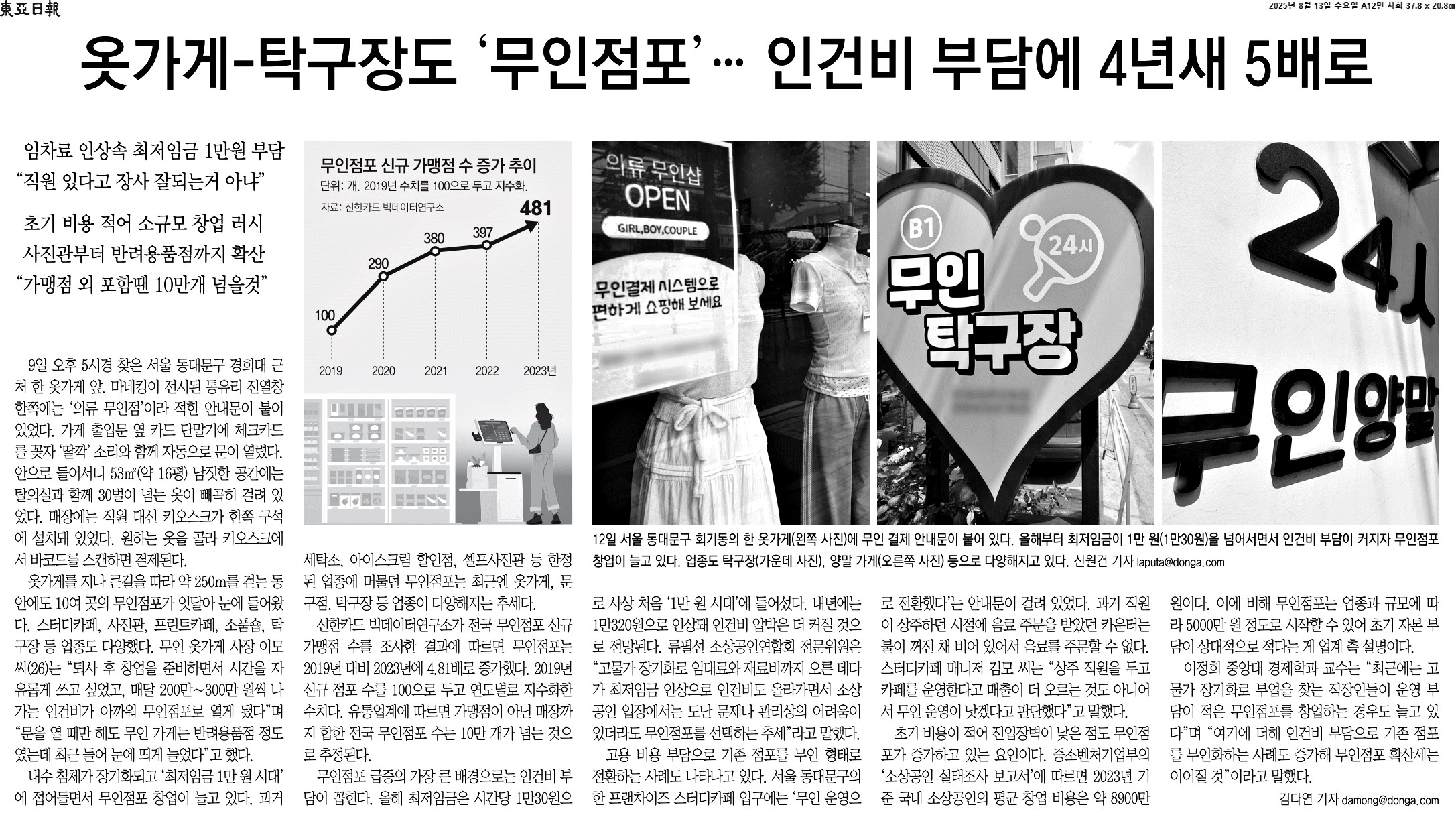 ③ 무인점포 급증의 가장 큰 배경으로는 인건비 부담이 꼽힌다. 올해 최저임금은 시간당 1만30원으로 사상 처음 ‘1만 원 시대’에 들어섰다. 내년에는 1만320원으로 인상돼 인건비 압박은 더 커질 것으로 전망된다. 류필선 소상공인연합회 전문위원은 “고물가 장기화로 임대료와 재료비까지 오른 데다가 최저임금 인상으로 인건비도 올라가면서 소상공인 입장에서는 도난 문제나 관리상의 어려움이 있더라도 무인점포를 선택하는 추세”라고 말했다.