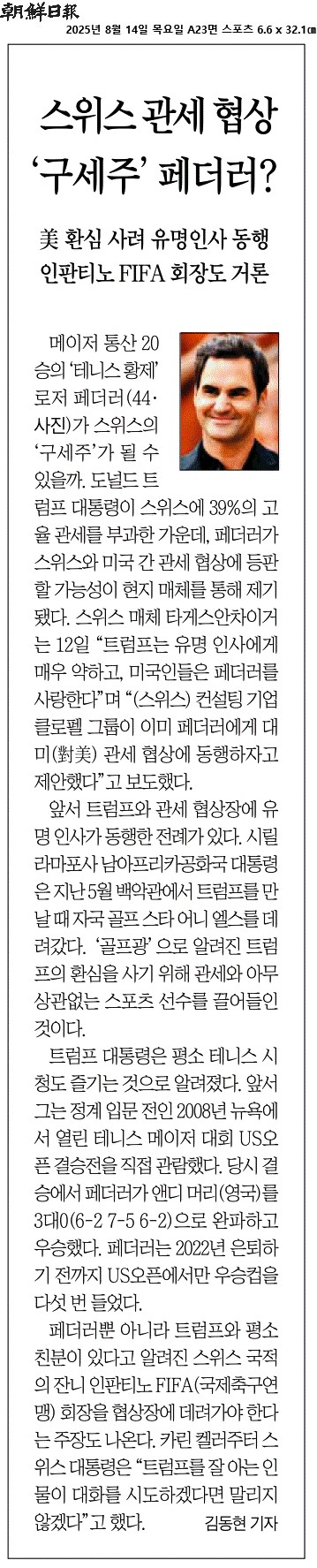 ② 스위스 매체 타게스안차이거는 12일 “트럼프는 유명 인사에게 매우 약하고, 미국인들은 페더러를 사랑한다”며 “(스위스) 컨설팅 기업 클로펠 그룹이 이미 페더러에게 대미(對美) 관세 협상에 동행하자고 제안했다”고 보도했다.