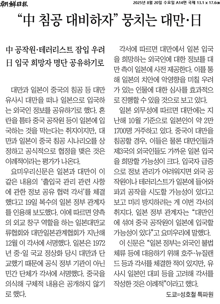 ② 요미우리신문은 일본과 대만이 이 같은 내용의 ‘출입국 관리 관련 사항에 관한 정보 공유 협력 각서’를 체결했다고 19일 복수의 일본 정부 관계자를 인용해 보도했다.