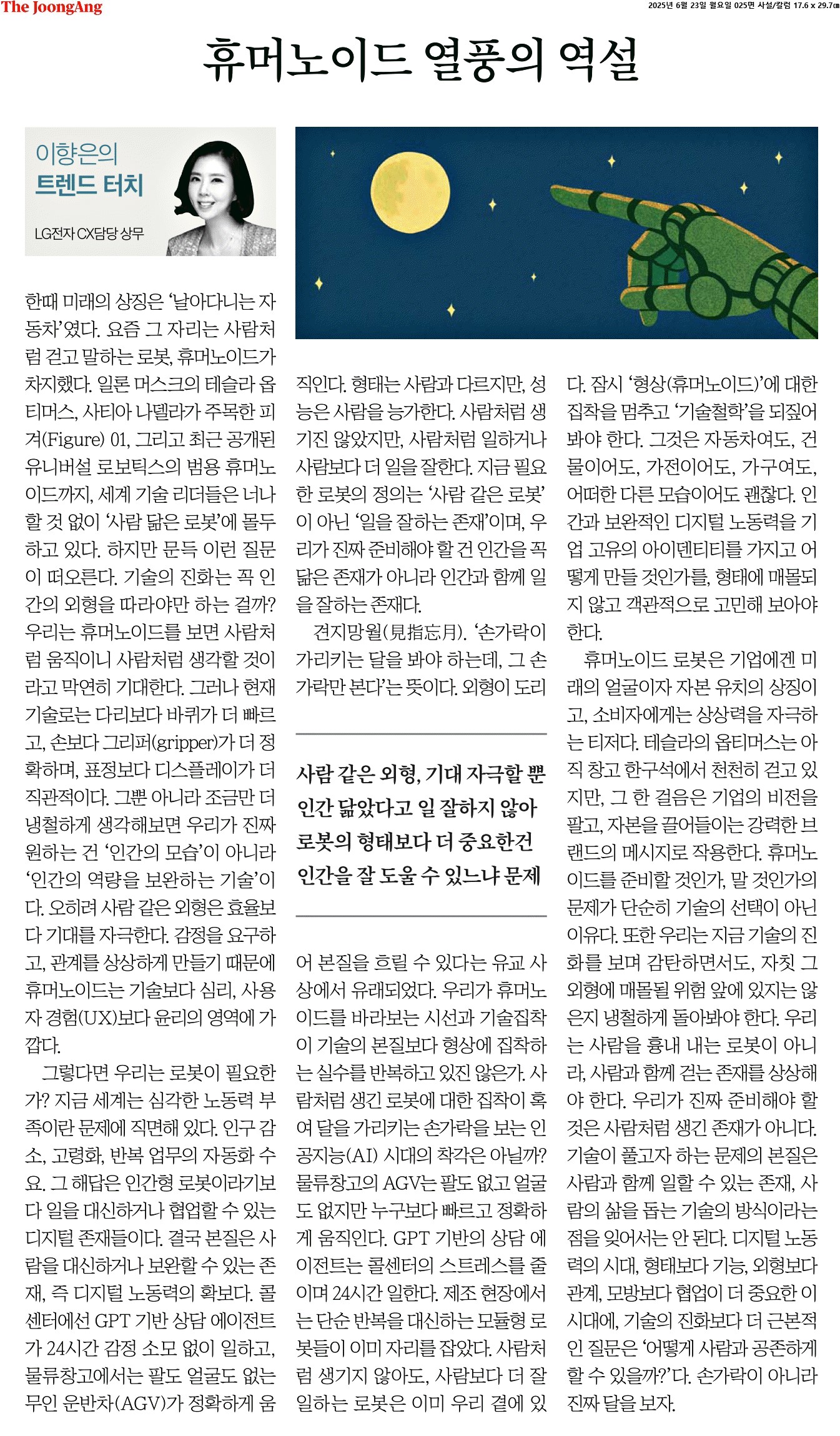 ⑤ 견지망월(見指忘月). ‘손가락이 가리키는 달을 봐야 하는데, 그 손가락만 본다’는 뜻이다. 외형이 도리어 본질을 흐릴 수 있다는 유교 사상에서 유래되었다. 우리가 휴머노이드를 바라보는 시선과 기술집착이 기술의 본질보다 형상에 집착하는 실수를 반복하고 있진 않은가. 사람처럼 생긴 로봇에 대한 집착이 혹여 달을 가리키는 손가락을 보는 인공지능(AI) 시대의 착각은 아닐까?