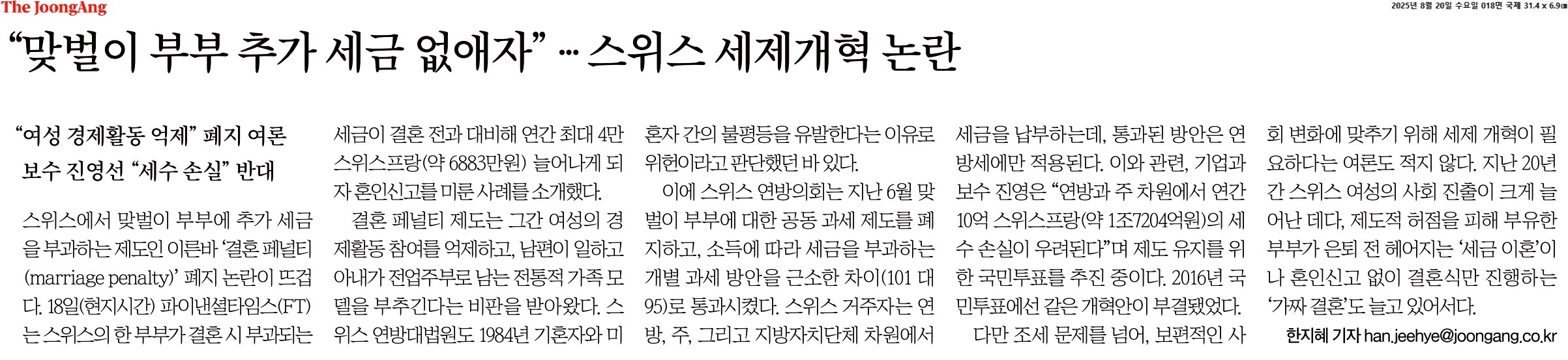 ⑤ 다만 조세 문제를 넘어, 보편적인 사회 변화에 맞추기 위해 세제 개혁이 필요하다는 여론도 적지 않다. 지난 20년간 스위스 여성의 사회 진출이 크게 늘어난 데다, 제도적 허점을 피해 부유한 부부가 은퇴 전 헤어지는 ‘세금 이혼’이나 혼인신고 없이 결혼식만 진행하는 ‘가짜 결혼’도 늘고 있어서다.