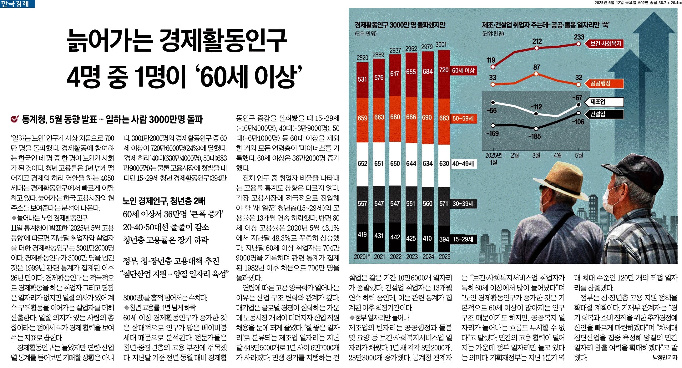 ③ 60세 이상 경제활동인구가 증가한 것은 상대적으로 인구가 많은 베이비붐 세대 때문으로 분석된다. 전문가들은 청년·중장년층의 고용 부진에 주목했다.