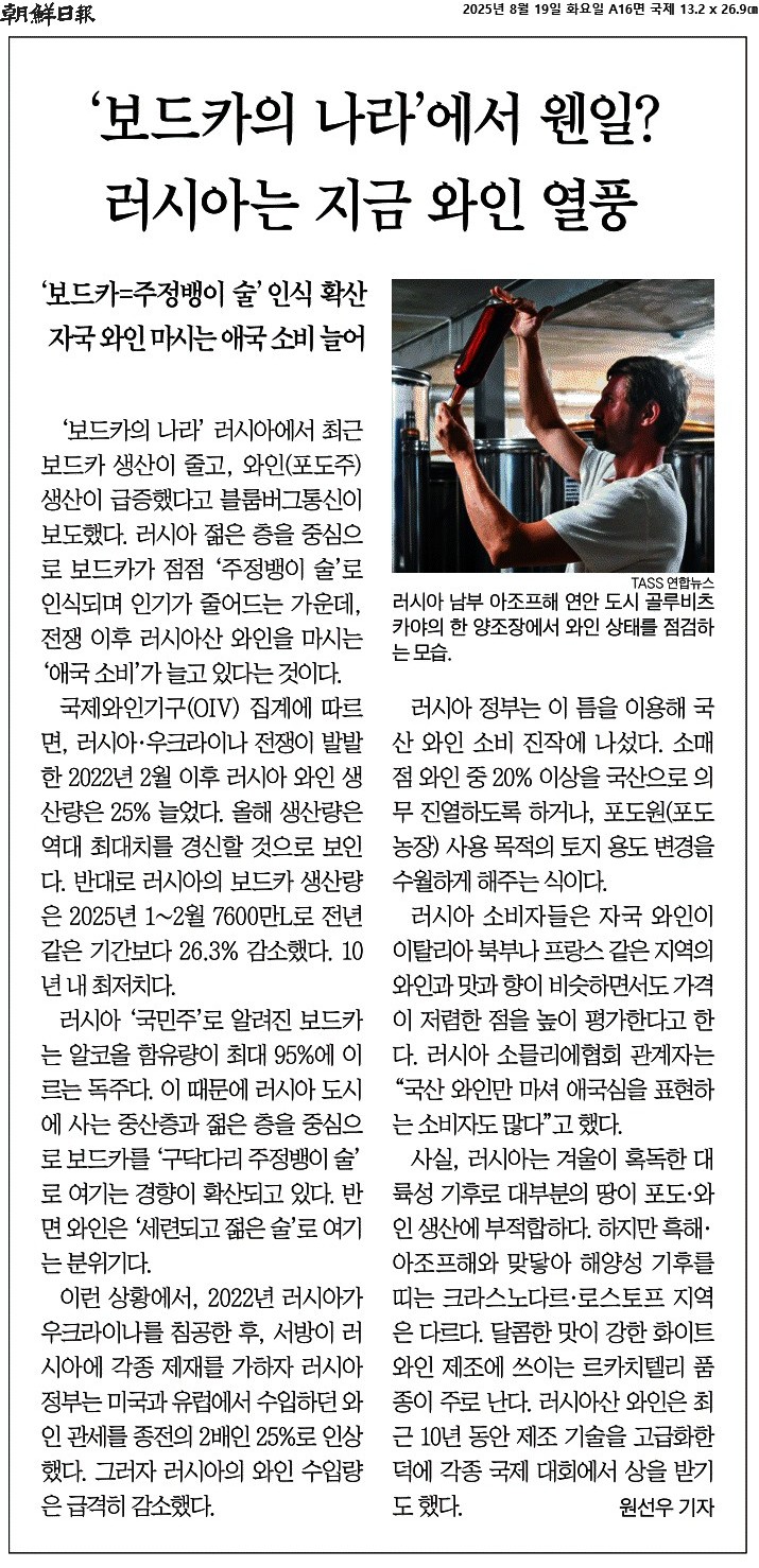 ② 국제와인기구(OIV) 집계에 따르면, 러시아·우크라이나 전쟁이 발발한 2022년 2월 이후 러시아 와인 생산량은 25% 늘었다. 올해 생산량은 역대 최대치를 경신할 것으로 보인다. 반대로 러시아의 보드카 생산량은 2025년 1∼2월 7600만L로 전년 같은 기간보다 26.3% 감소했다. 이는 10년 내 최저치다.