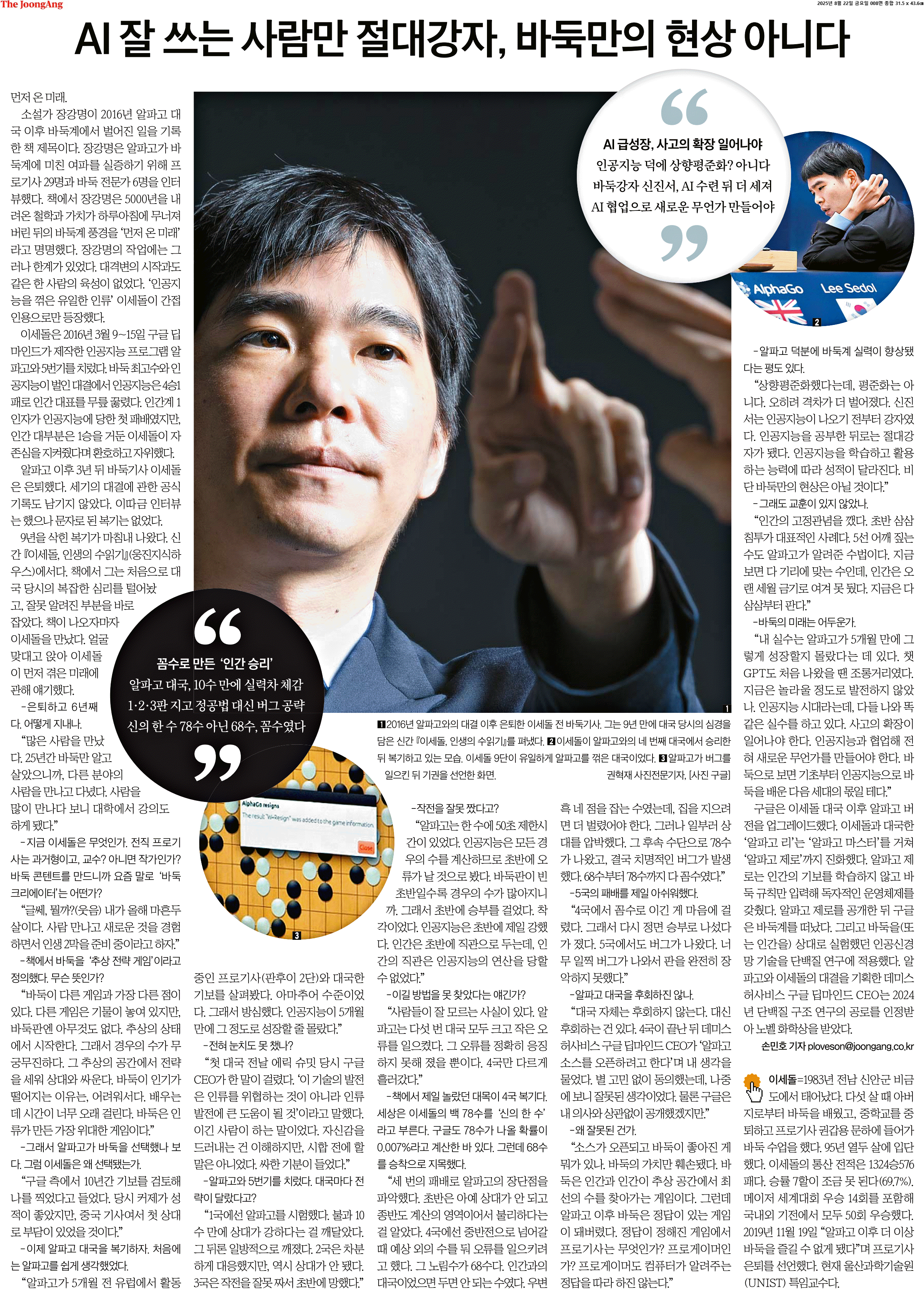 ⑤ “상향평준화했다는데, 평준화는 아니다. 오히려 격차가 더 벌어졌다. 신진서는 인공지능이 나오기 전부터 강자였다. 인공지능을 공부한 뒤로는 절대강자가 됐다. 인공지능을 학습하고 활용하는 능력에 따라 성적이 달라진다. 비단 바둑만의 현상은 아닐 것이다.”