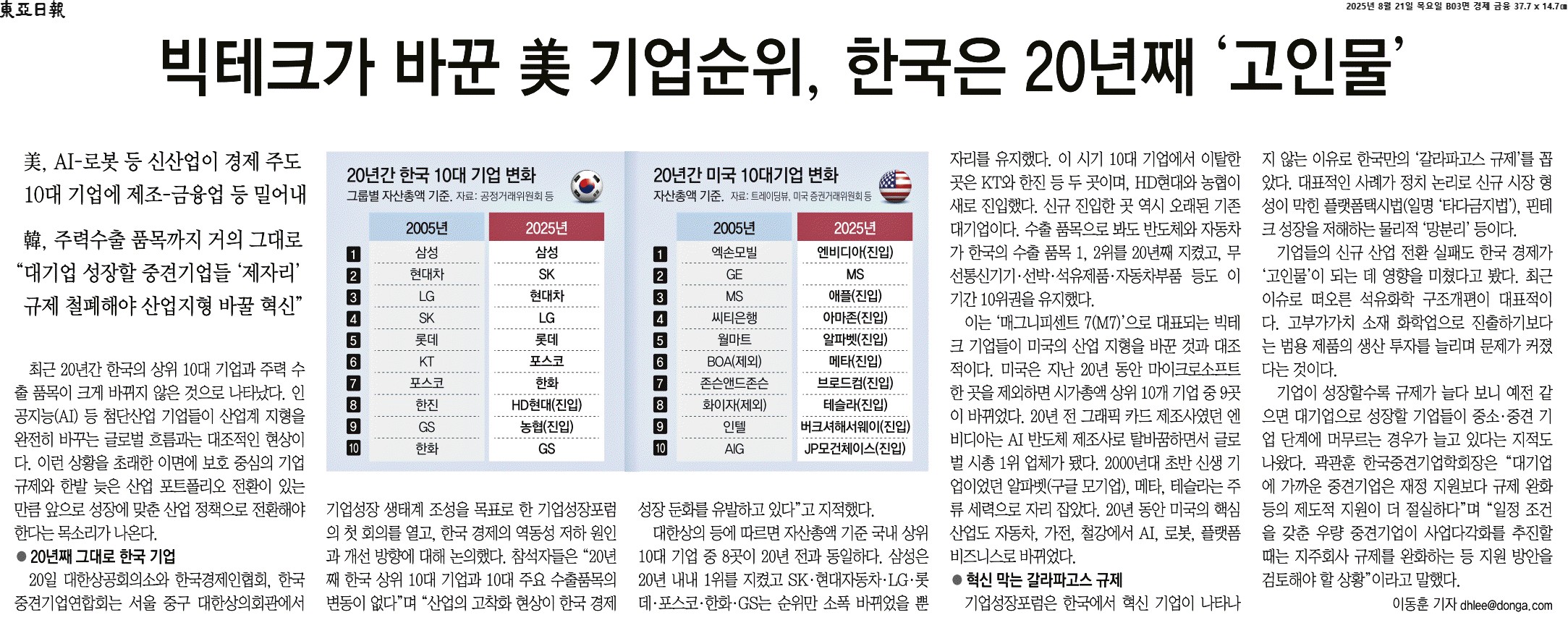 ② 대한상의 등에 따르면 자산총액 기준 국내 상위 10대 기업 중 8곳이 20년 전과 동일하다. 삼성은 20년 내내 1위를 지켰고 SK·현대자동차·LG·롯데·포스코·한화·GS는 순위만 소폭 바뀌었을 뿐 자리를 유지했다. 이 시기 10대 기업에서 이탈한 곳은 KT와 한진 등 두 곳이며, HD현대와 농협이 새로 진입했다. 신규 진입한 곳 역시 오래된 기존 대기업이다. 수출 품목으로 봐도 반도체와 자동차가 한국의 수출 품목 1, 2위를 20년째 지켰고, 무선통신기기·선박·석유제품·자동차부품 등도 이 기간 10위권을 유지했다.