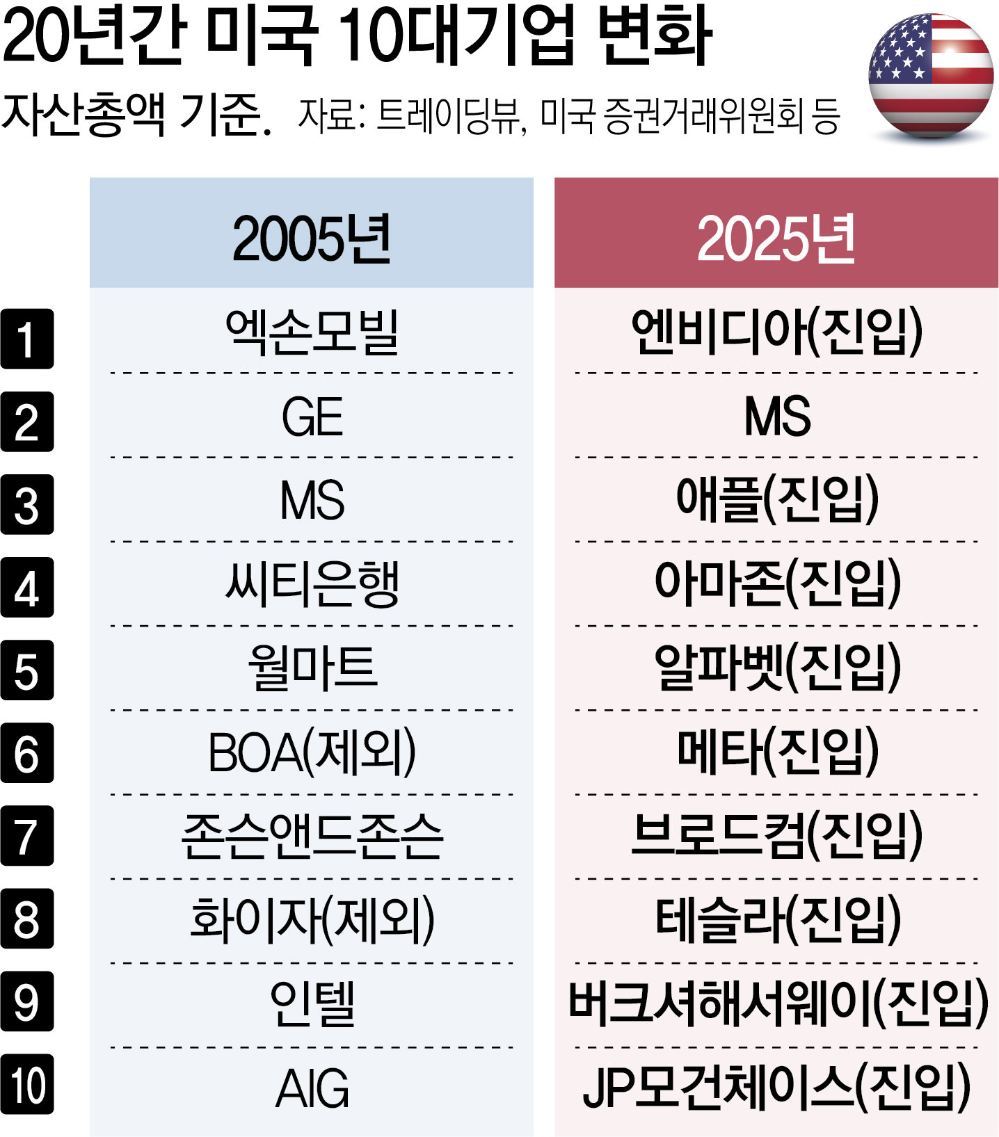 ③ 이는 ‘매그니피센트 7(M7)’으로 대표되는 빅테크 기업들이 미국의 산업 지형을 바꾼 것과 대조적이다. 미국은 지난 20년 동안 마이크로소프트 한 곳을 제외하면 시가총액 상위 10개 기업 중 9곳이 바뀌었다. 20년 전 그래픽 카드 제조사였던 엔비디아는 AI 반도체 제조사로 탈바꿈하면서 글로벌 시총 1위 업체가 됐다. 2000년대 초반 신생 기업이었던 알파벳(구글 모기업), 메타, 테슬라는 주류 세력으로 자리 잡았다. 20년 동안 미국의 핵심 산업도 자동차, 가전, 철강에서 AI, 로봇, 플랫폼 비즈니스로 바뀌었다.
