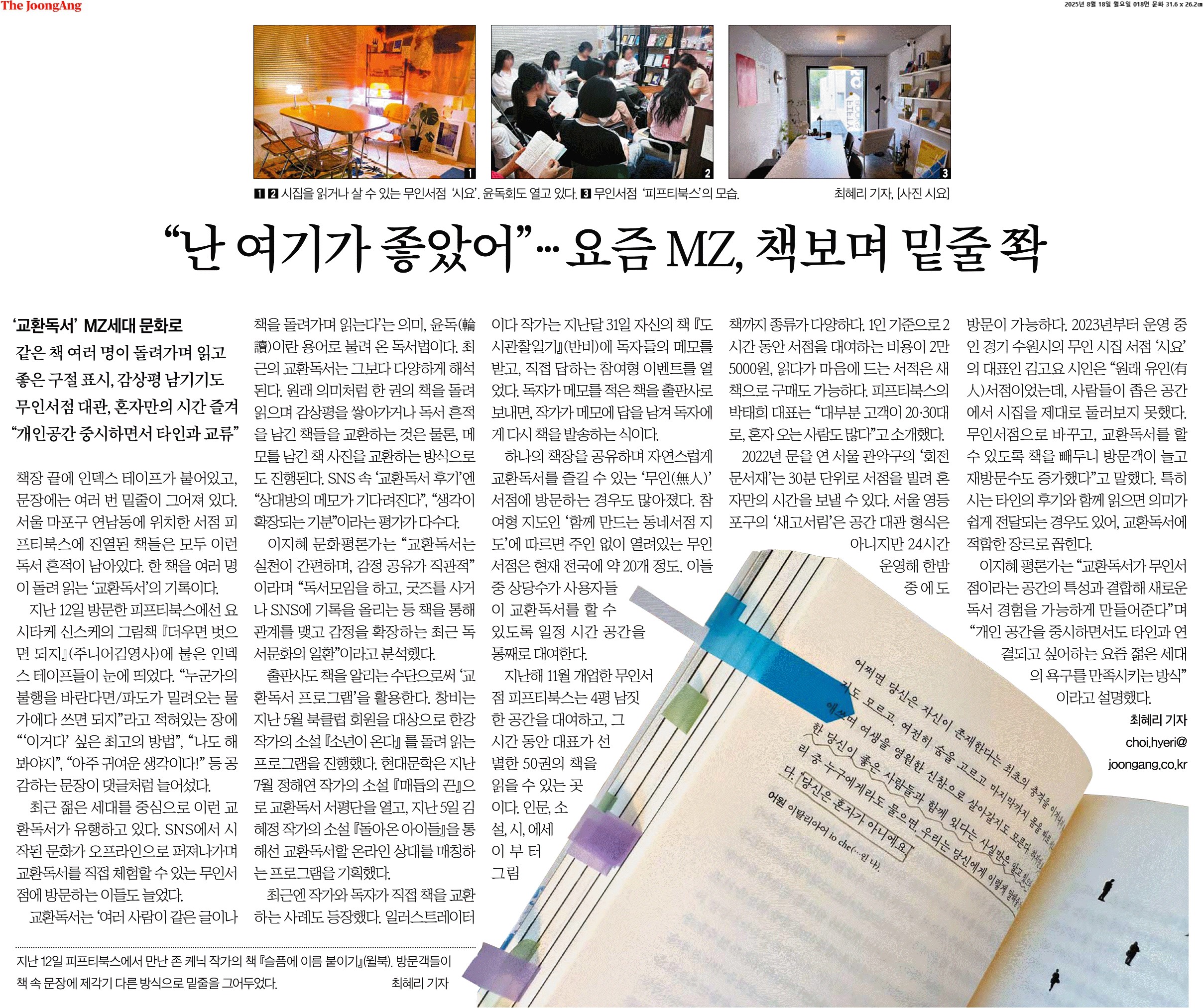 ⑤ 이지혜 평론가는 “교환독서가 무인서점이라는 공간의 특성과 결합해 새로운 독서 경험을 가능하게 만들어준다”며 “개인 공간을 중시하면서도 타인과 연결되고 싶어하는 요즘 젊은 세대의 욕구를 만족시키는 방식”이라고 설명했다.