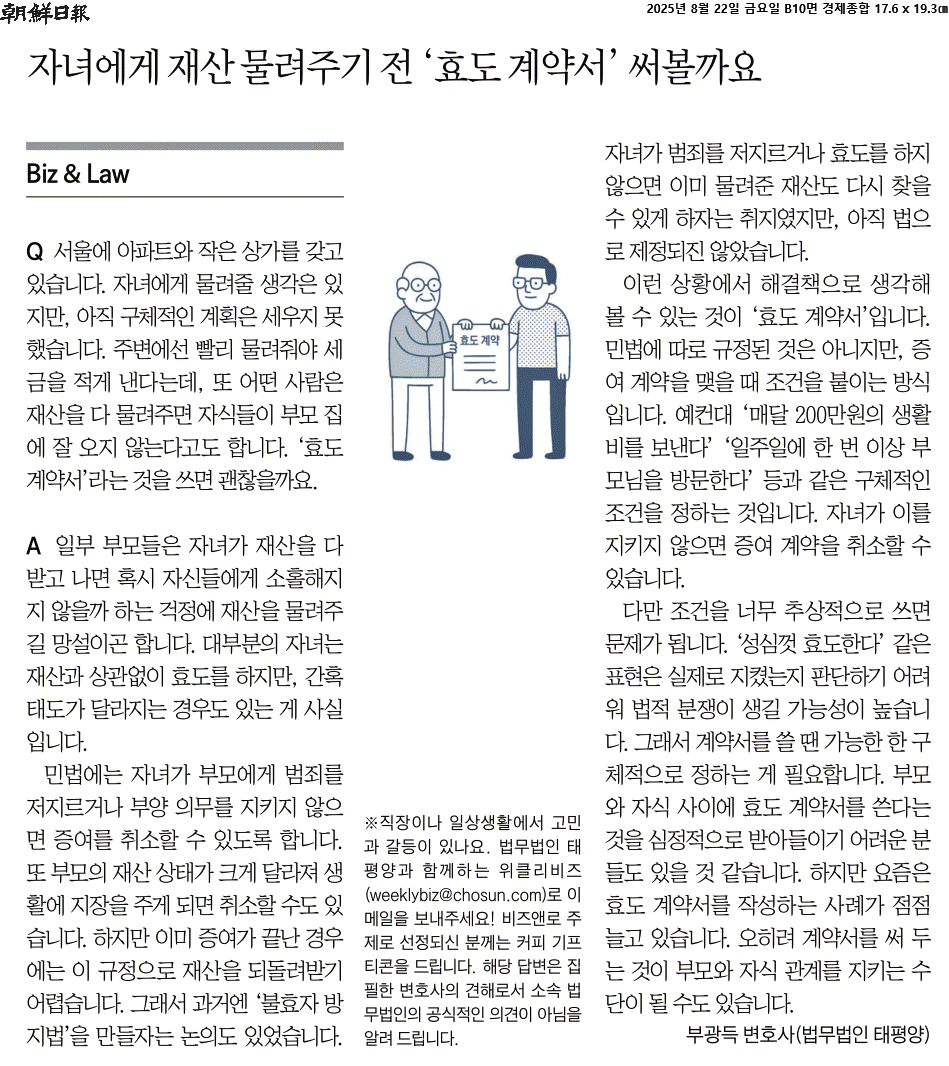 ③ 이런 상황에서 해결책으로 생각해 볼 수 있는 것이 ‘효도 계약서’입니다. 민법에 따로 규정된 것은 아니지만, 증여 계약을 맺을 때 조건을 붙이는 방식입니다. 예컨대 ‘매달 200만원의 생활비를 보낸다’ ‘일주일에 한 번 이상 부모님을 방문한다’ 등과 같은 구체적인 조건을 정하는 것입니다. 자녀가 이를 지키지 않으면 증여 계약을 취소할 수 있습니다.