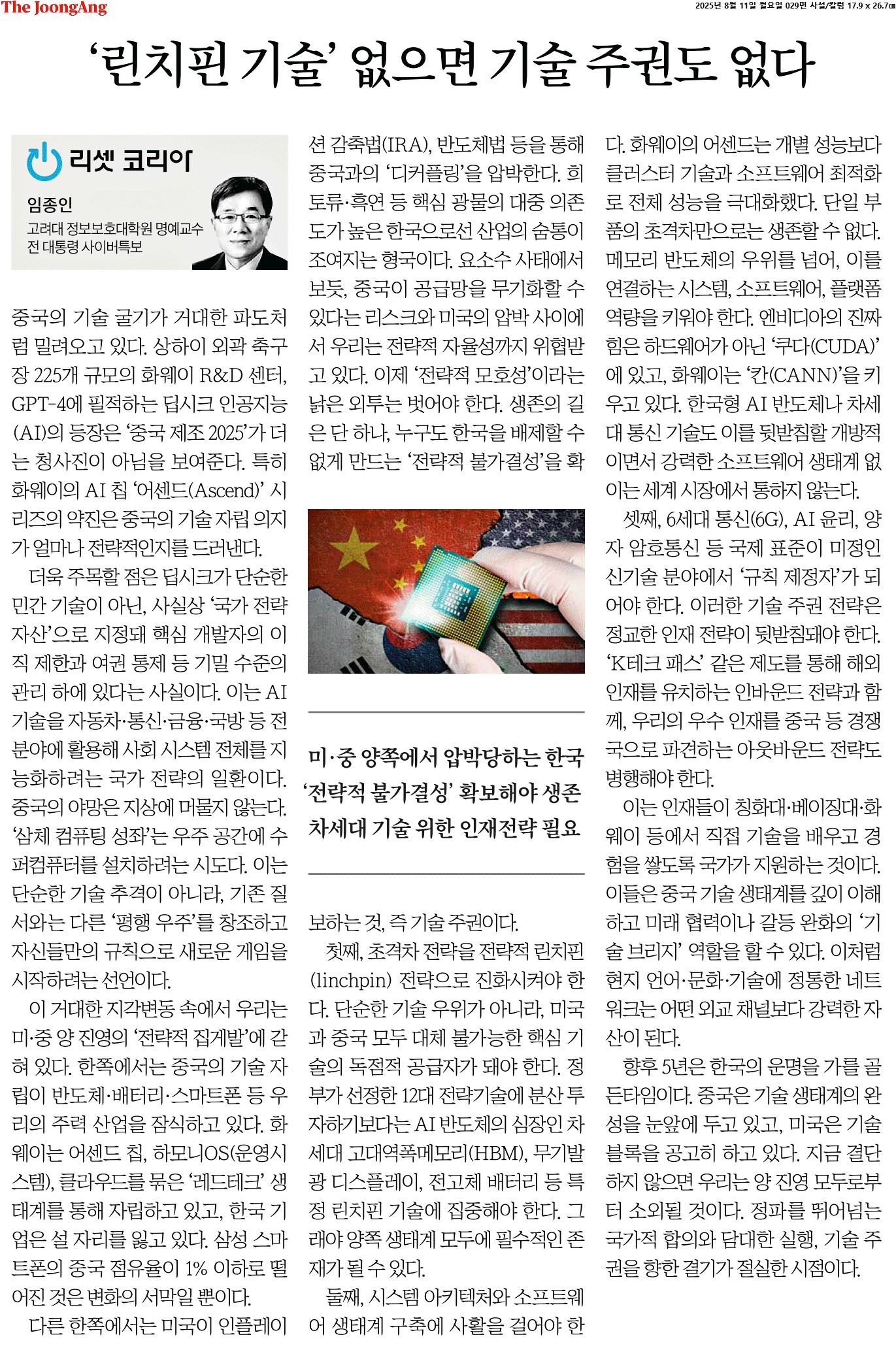 ③ 첫째, 초격차 전략을 전략적 린치핀(linchpin) 전략으로 진화시켜야 한다. 단순한 기술 우위가 아니라, 미국과 중국 모두 대체 불가능한 핵심 기술의 독점적 공급자가 돼야 한다.