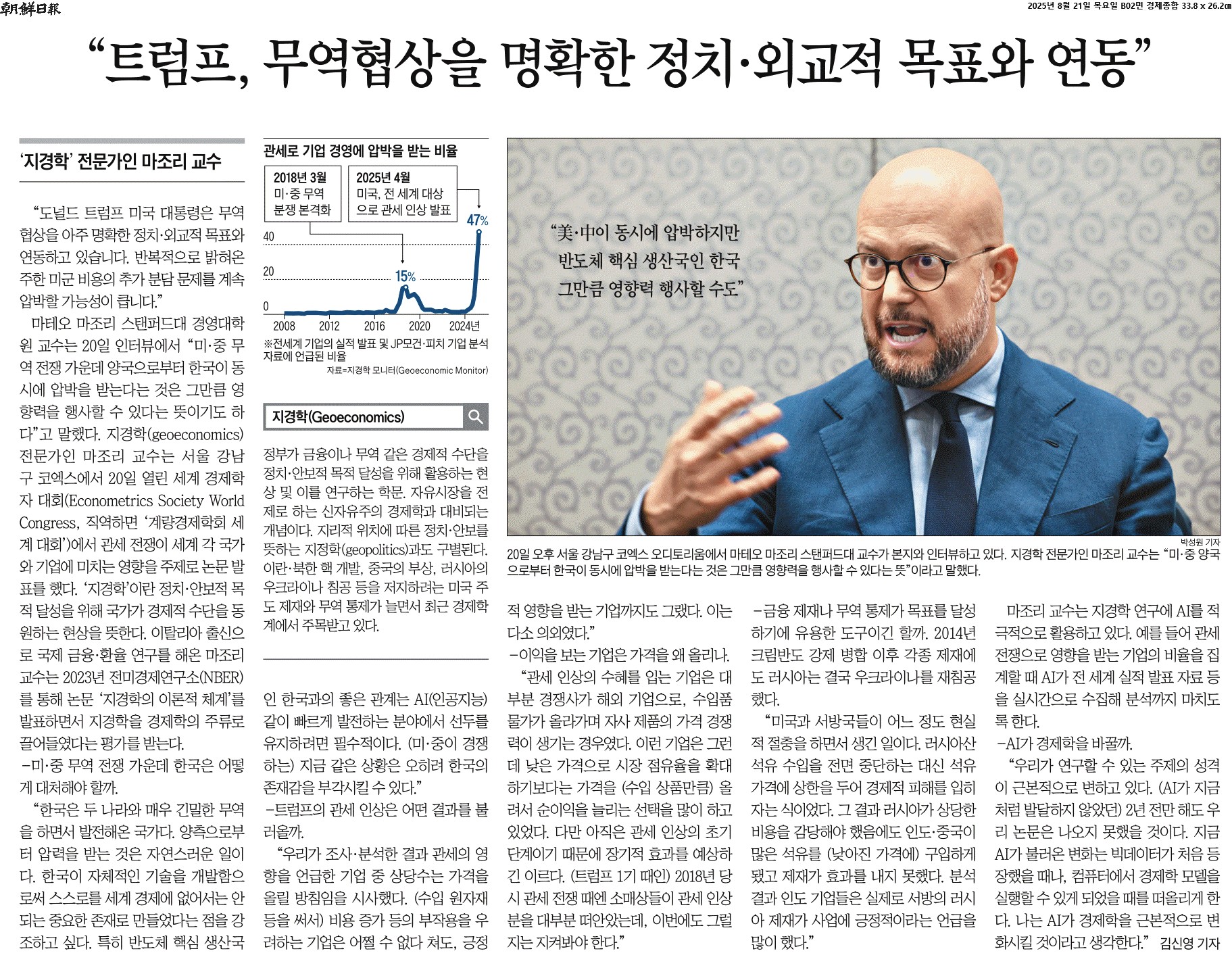 ② 지경학(geoeconomics) 전문가인 마조리 교수는 서울 강남구 코엑스에서 20일 열린 세계 경제학자 대회(Econometric Society World Congress, 직역하면 ‘계량경제학회 세계 대회’)에서 관세 전쟁이 세계 각 국가와 기업에 미치는 영향을 주제로 논문 발표를 했다. ‘지경학’이란 정치·안보적 목적 달성을 위해 국가가 경제적 수단을 동원하는 현상을 뜻한다.