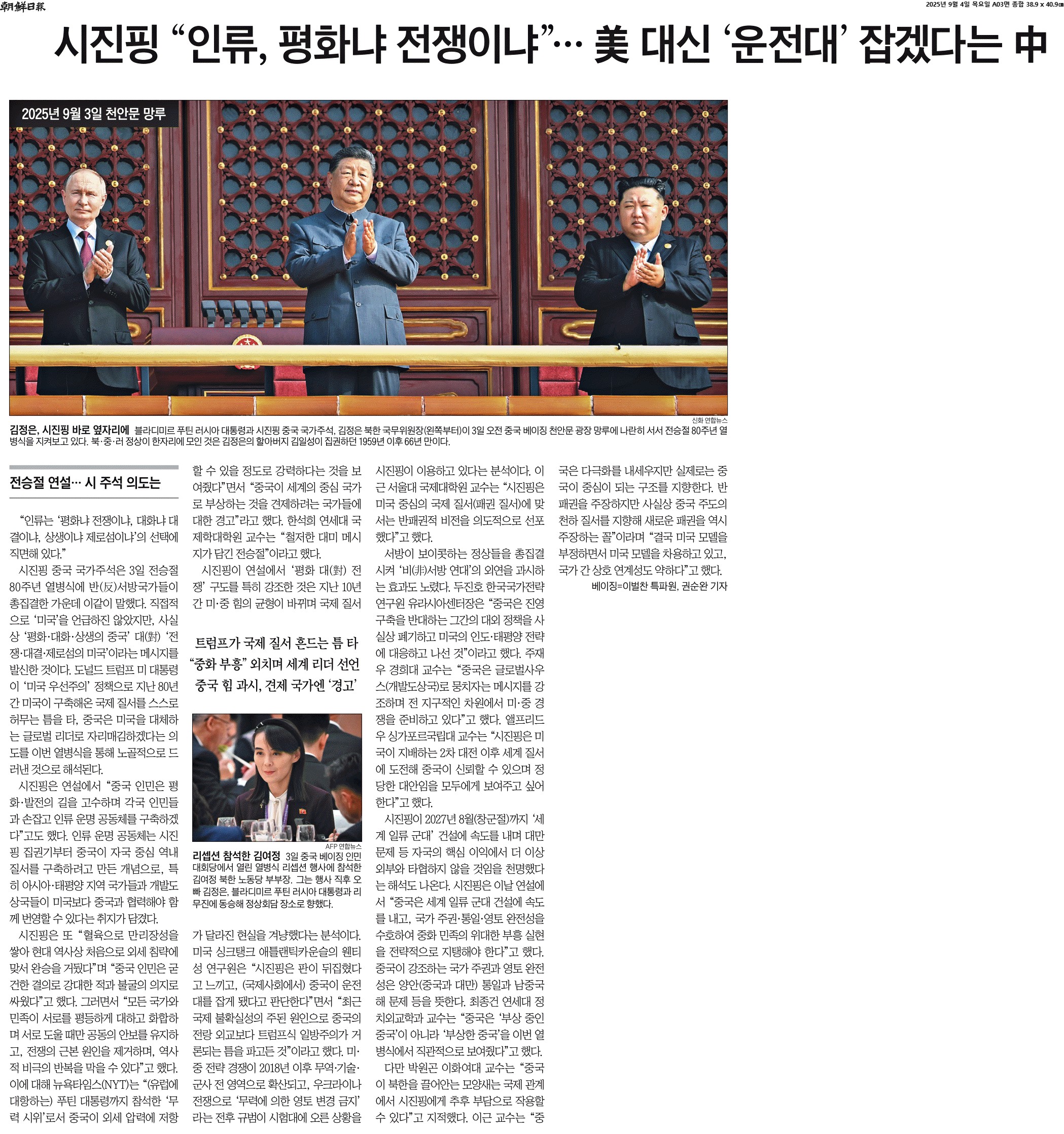 시진핑 중국 국가주석은 3일 전승절 80주년 열병식에 반(反)서방국가들이 총집결한 가운데 이같이 말했다. 직접적으로 ‘미국’을 언급하진 않았지만, 사실상 ‘평화·대화·상생의 중국’ 대(對) ‘전쟁·대결·제로섬의 미국’이라는 메시지를 발신한 것이다. 도널드 트럼프 미 대통령이 ‘미국 우선주의’ 정책으로 지난 80년간 미국이 구축해온 국제 질서를 스스로 허무는 틈을 타, 중국은 미국을 대체하는 글로벌 리더로 자리매김하겠다는 의도를 이번 열병식을 통해 노골적으로 드러낸 것으로 해석된다.