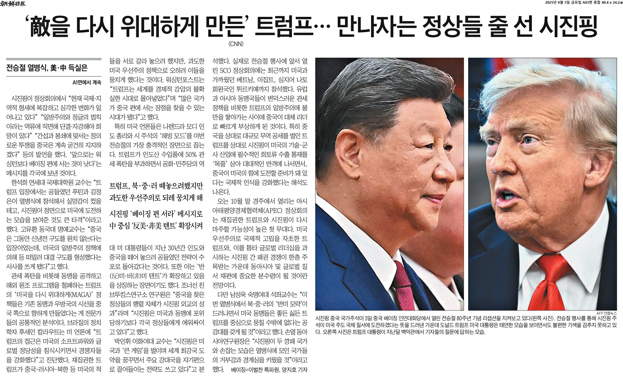 ③ 한석희 연세대 국제대학원 교수는 “트럼프 입장에서는 공들였던 푸틴과 김정은이 열병식에 참석해서 실망감이 컸을 테고, 시진핑이 정면으로 미국에 도전하는 모습을 보여준 것도 큰 타격”이라고 했다. 고유환 동국대 명예교수는 “중국은 그동안 신냉전 구도를 원치 않는다는 입장이었는데, 미국의 일방주의 정책에 의해 등 떠밀려 대결 구도를 형성했다는 서사를 쓰게 됐다”고 했다.