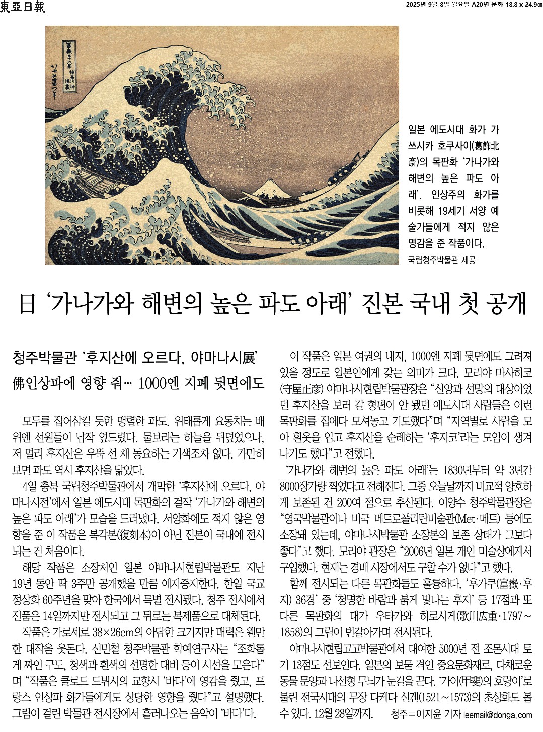② 4일 충북 국립청주박물관에서 개막한 ‘후지산에 오르다, 야마나시전’에서 일본 에도시대 목판화의 걸작 ‘가나가와 해변의 높은 파도 아래’가 모습을 드러냈다. 서양화에도 적지 않은 영향을 준 이 작품은 복각본(復刻本)이 아닌 진본이 국내에 전시되는 건 처음이다.