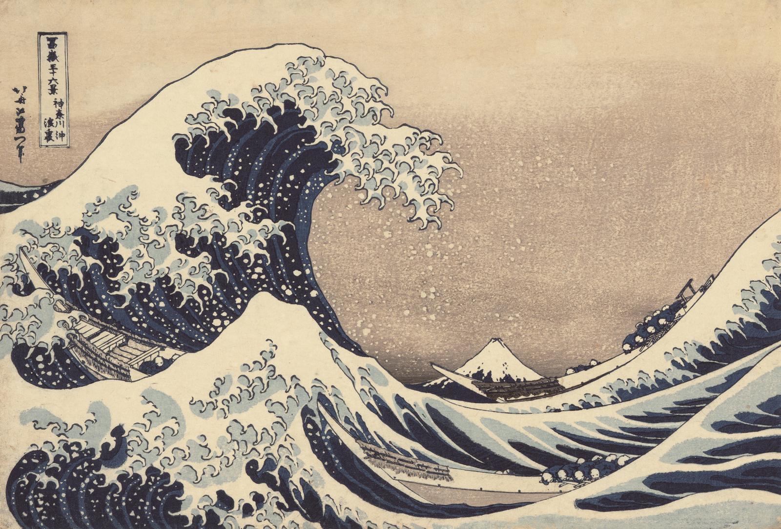 ① 모두를 집어삼킬 듯한 맹렬한 파도. 위태롭게 요동치는 배 위엔 선원들이 납작 엎드렸다. 물보라는 하늘을 뒤덮었으나, 저 멀리 후지산은 우뚝 선 채 동요하는 기색조차 없다. 가만히 보면 파도 역시 후지산을 닮았다.