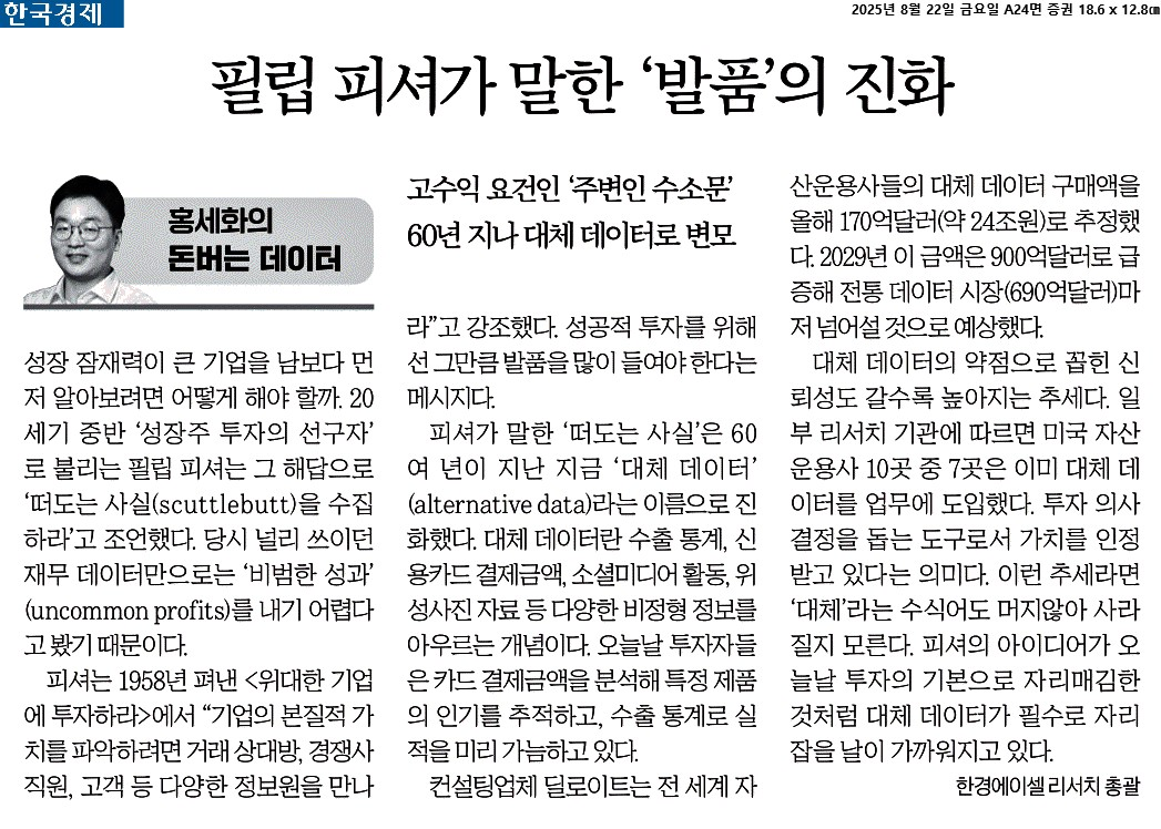 ③ 피셔가 말한 ‘떠도는 사실’은 60여 년이 지난 지금 ‘대체 데이터’(alternative data)라는 이름으로 진화했다. 대체 데이터란 수출 통계, 신용카드 결제금액, 소셜미디어 활동, 위성사진 자료 등 다양한 비정형 정보를 아우르는 개념이다. 오늘날 투자자들은 카드 결제금액을 분석해 특정 제품의 인기를 추적하고, 수출 통계로 실적을 미리 가늠하고 있다.
