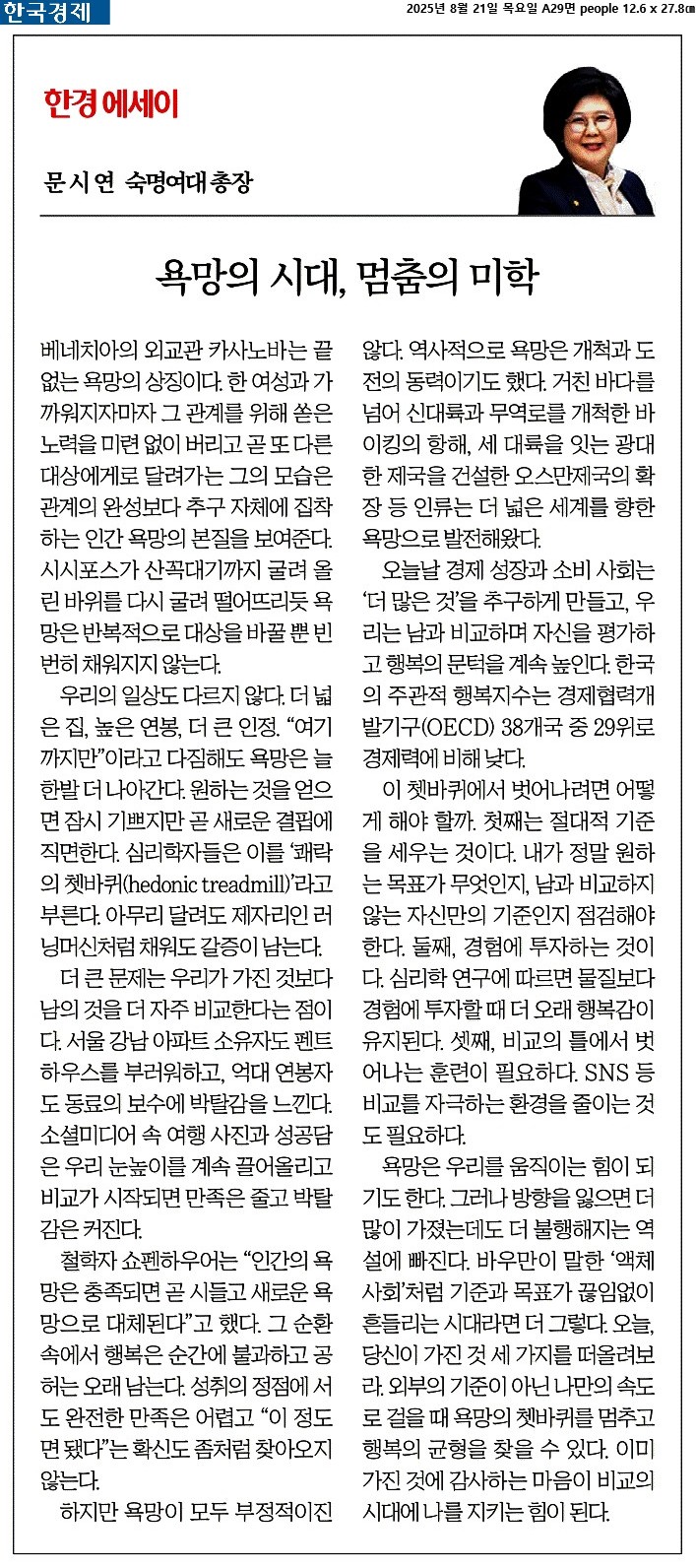 ⑤ 욕망은 우리를 움직이는 힘이 되기도 한다. 그러나 방향을 잃으면 더 많이 가졌는데도 더 불행해지는 역설에 빠진다. 바우만이 말한 ‘액체 사회’처럼 기준과 목표가 끊임없이 흔들리는 시대라면 더 그렇다. 오늘, 당신이 가진 것 세 가지를 떠올려보라. 외부의 기준이 아닌 나만의 속도로 걸을 때 욕망의 쳇바퀴를 멈추고 행복의 균형을 찾을 수 있다. 이미 가진 것에 감사하는 마음이 비교의 시대에 나를 지키는 힘이 된다.