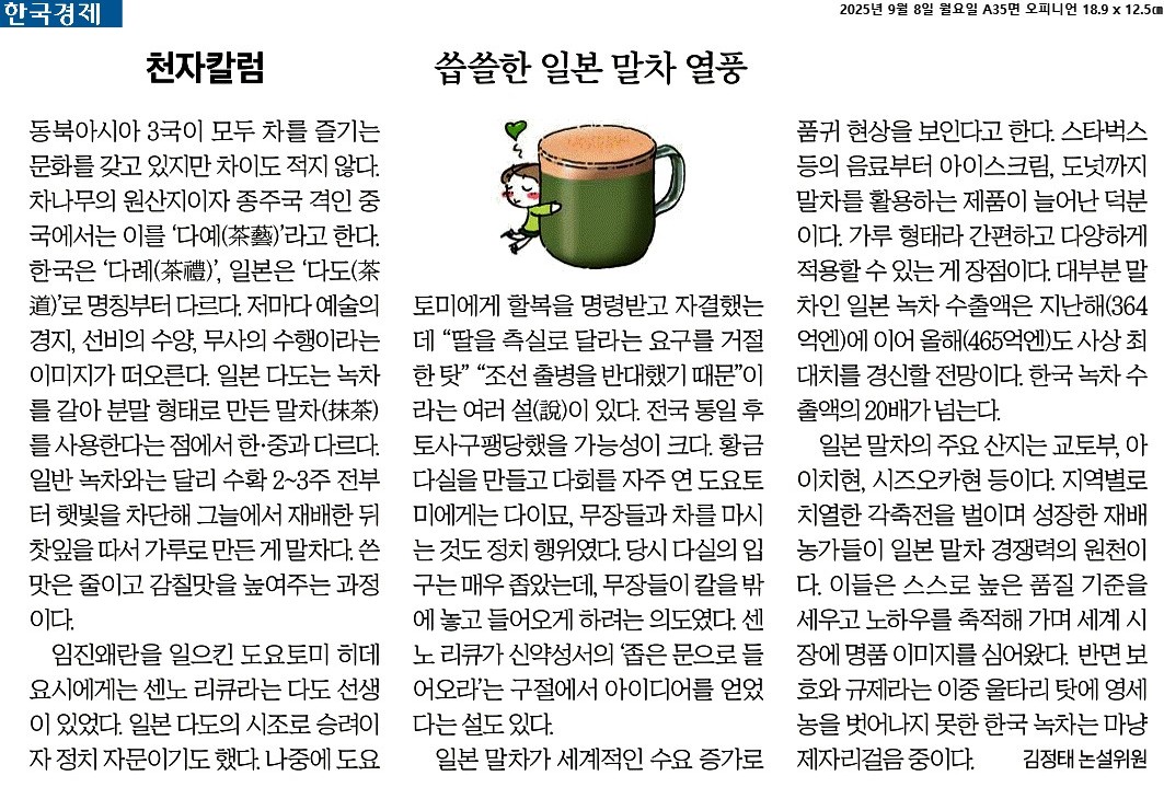 ⑤ 일본 말차의 주요 산지는 교토부, 아이치현, 시즈오카현 등이다. 지역별로 치열한 각축전을 벌이며 성장한 재배 농가들이 일본 말차 경쟁력의 원천이다. 이들은 스스로 높은 품질 기준을 세우고 노하우를 축적해 가며 세계 시장에 명품 이미지를 심어왔다. 반면 보호와 규제라는 이중 울타리 탓에 영세농을 벗어나지 못한 한국 녹차는 마냥 제자리걸음 중이다.