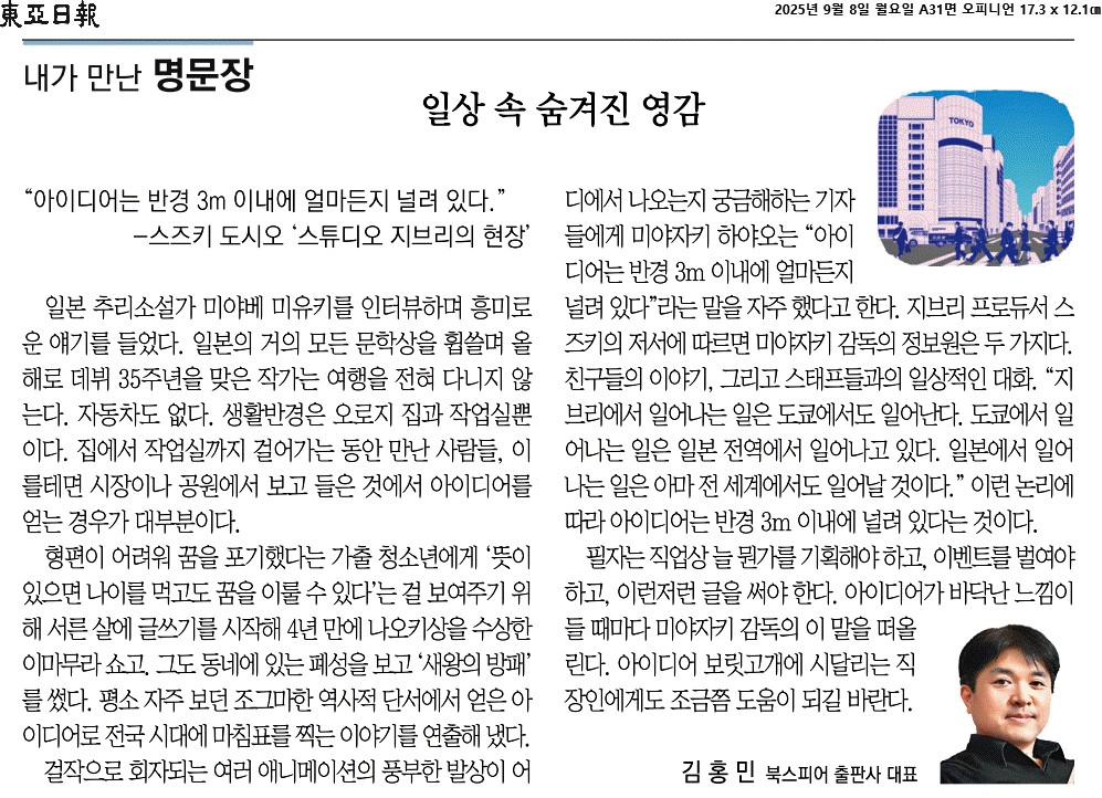 ⑤ 필자는 직업상 늘 뭔가를 기획해야 하고, 이벤트를 벌여야 하고, 이런저런 글을 써야 한다. 아이디어가 바닥난 느낌이 들 때마다 미야자키 감독의 이 말을 떠올린다. 아이디어 보릿고개에 시달리는 직장인에게도 조금쯤 도움이 되길 바란다.