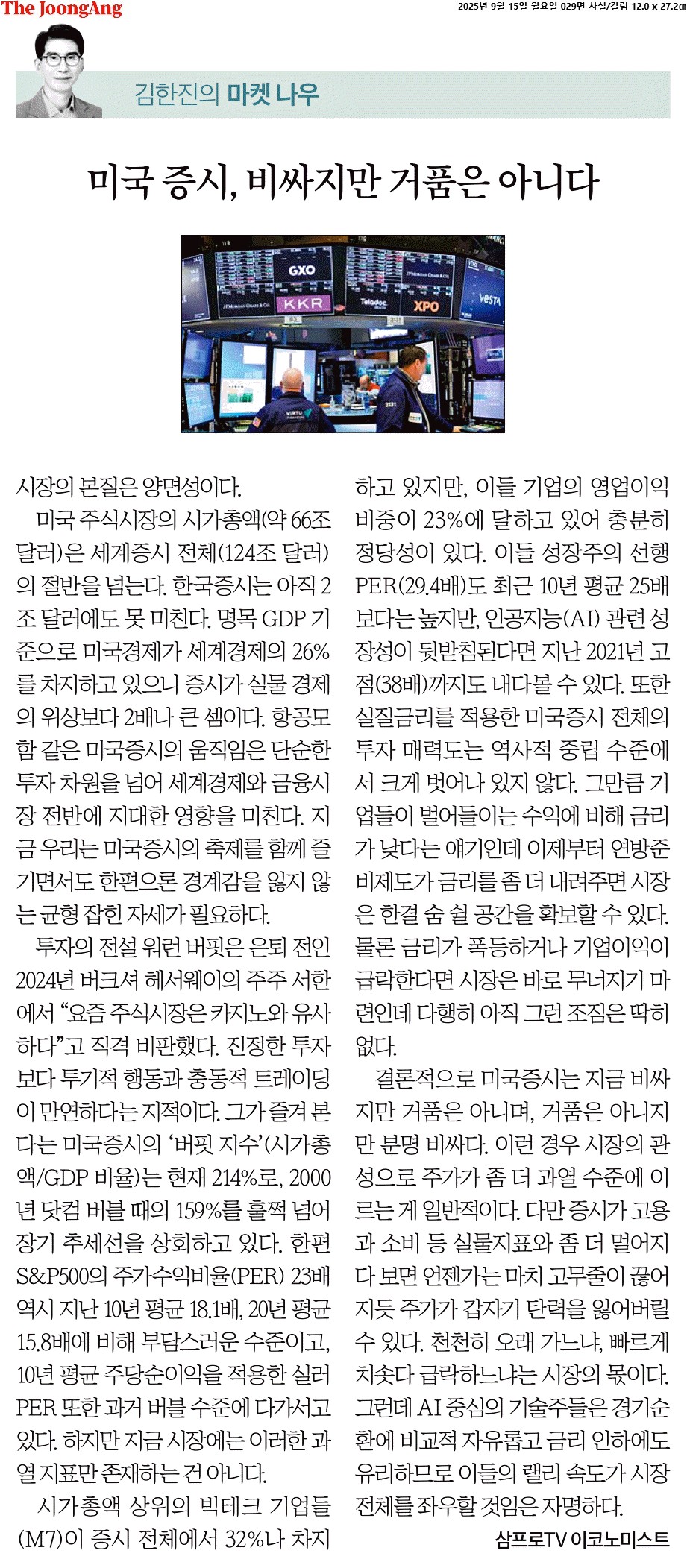 ⑤ 결론적으로 미국증시는 지금 비싸지만 거품은 아니며, 거품은 아니지만 분명 비싸다. 이런 경우 시장의 관성으로 주가가 좀 더 과열 수준에 이르는 게 일반적이다. 다만 증시가 고용과 소비 등 실물지표와 좀 더 멀어지다 보면 언젠가는 마치 고무줄이 끊어지듯 주가가 갑자기 탄력을 잃어버릴 수 있다. 천천히 오래 가느냐, 빠르게 치솟다 급락하느냐는 시장의 몫이다. 그런데 AI 중심의 기술주들은 경기순환에 비교적 자유롭고 금리 인하에도 유리하므로 이들의 랠리 속도가 시장 전체를 좌우할 것임은 자명하다.