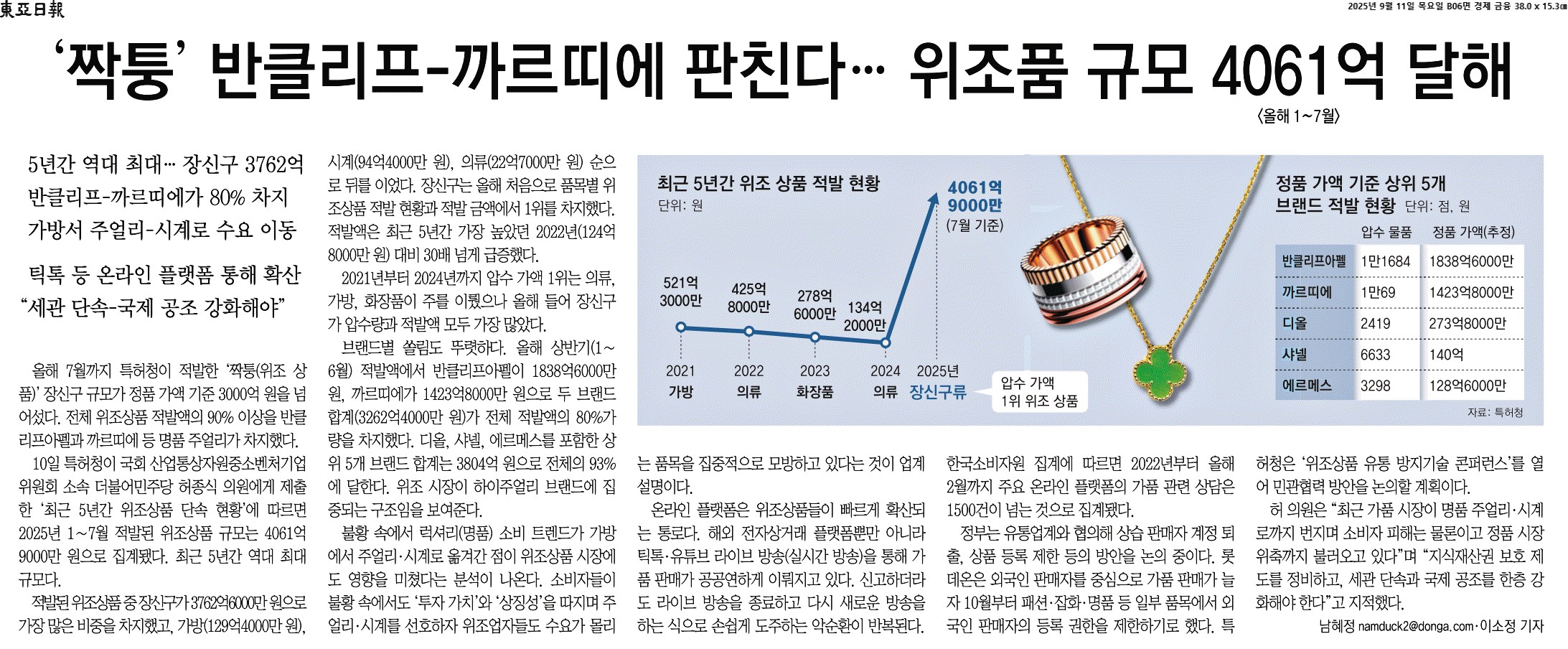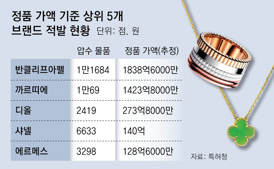 브랜드별 쏠림도 뚜렷하다. 올해 상반기(1∼6월) 적발액에서 반클리프아펠이 1838억6000만 원, 까르띠에가 1423억8000만 원으로 두 브랜드 합계(3262억4000만 원)가 전체 적발액의 80%가량을 차지했다. 디올, 샤넬, 에르메스를 포함한 상위 5개 브랜드 합계는 3804억 원으로 전체의 93%에 달한다. 위조 시장이 하이주얼리 브랜드에 집중되는 구조임을 보여준다.