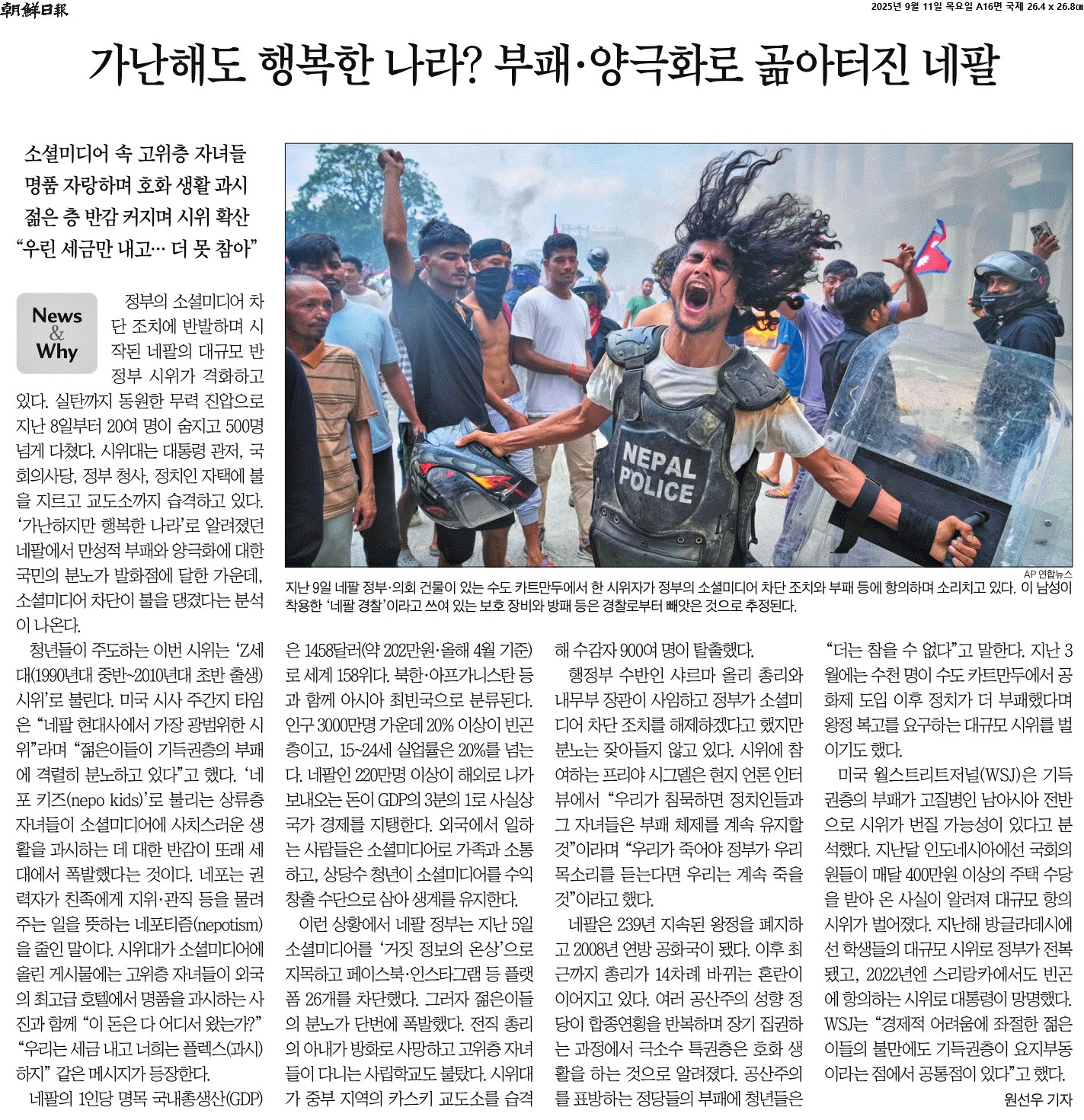 ① 정부의 소셜미디어 차단 조치에 반발하며 시작된 네팔의 대규모 반정부 시위가 격화하고 있다. 실탄까지 동원한 무력 진압으로 지난 8일부터 20여 명이 숨지고 500명 넘게 다쳤다. 시위대는 대통령 관저, 국회의사당, 정부 청사, 정치인 자택에 불을 지르고 교도소까지 습격하고 있다. ‘가난하지만 행복한 나라’로 알려졌던 네팔에서 만성적 부패와 양극화에 대한 국민의 분노가 발화점에 달한 가운데, 소셜미디어 차단이 불을 댕겼다는 분석이 나온다.