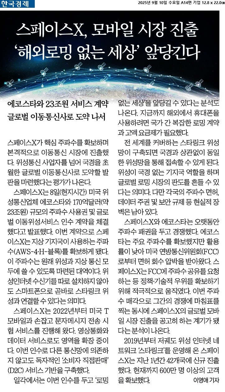 ① 스페이스X가 핵심 주파수를 확보하며 본격적으로 이동통신 시장에 진출했다. 위성통신 사업자를 넘어 국경을 초월한 글로벌 이동통신사로 도약할 발판을 마련했다는 평가가 나온다.