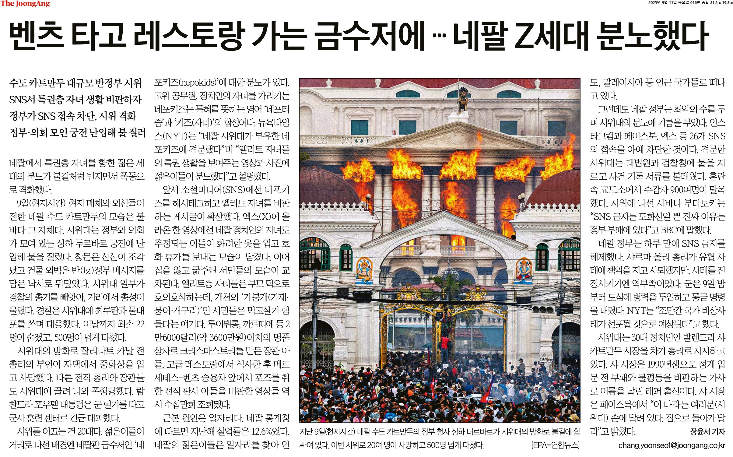 ① 네팔에서 특권층 자녀를 향한 젊은 세대의 분노가 불길처럼 번지면서 폭동으로 격화했다.