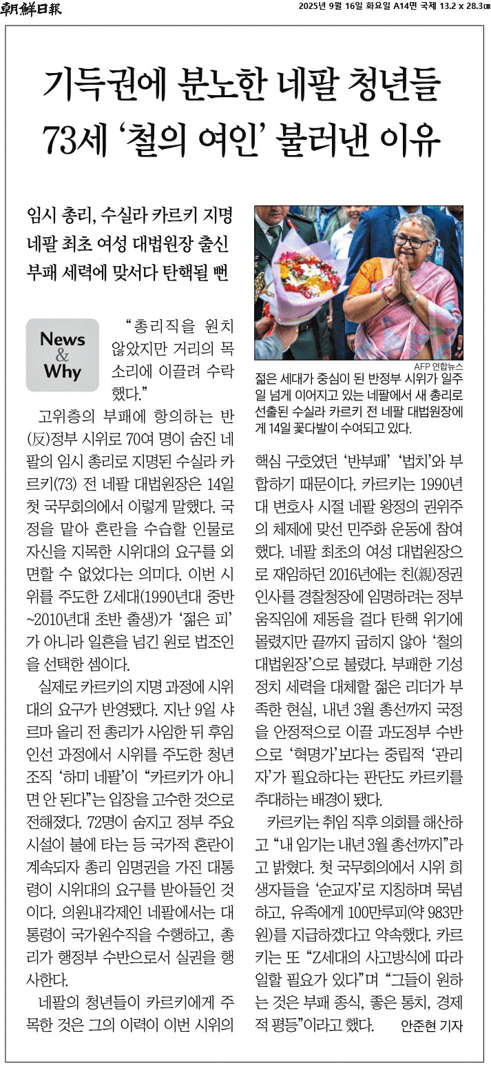 고위층의 부패에 항의하는 반(反)정부 시위로 70여 명이 숨진 네팔의 임시 총리로 지명된 수실라 카르키(73) 전 네팔 대법원장은 14일 첫 국무회의에서 이렇게 말했다. 국정을 맡아 혼란을 수습할 인물로 자신을 지목한 시위대의 요구를 외면할 수 없었다는 의미다. 이번 시위를 주도한 Z세대(1990년대 중반~2010년대 초반 출생)가 ‘젊은 피’가 아니라 일흔을 넘긴 원로 법조인을 선택한 셈이다.