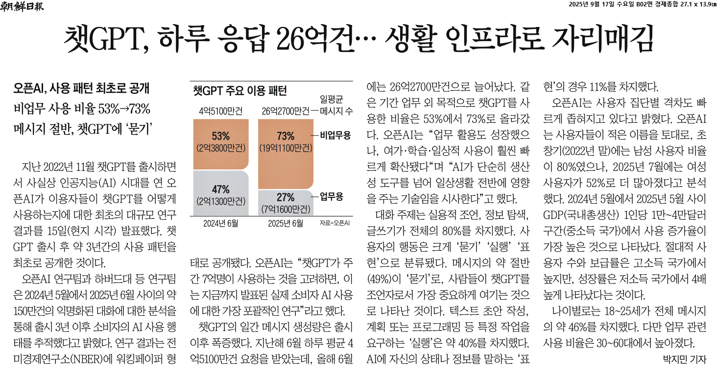 ② 챗GPT의 일간 메시지 생성량은 출시 이후 폭증했다. 지난해 6월 하루 평균 4억5100만건 요청을 받았는데, 올해 6월에는 26억2700만건으로 늘어났다. 같은 기간 업무 외 목적으로 챗GPT를 사용한 비율은 53%에서 73%로 올라갔다. 오픈AI는 "업무 활용도 성장했으나, 여가·학습·일상적 사용이 훨씬 빠르게 확산됐다"며 "AI가 단순히 생산성 도구를 넘어 일상생활 전반에 영향을 주는 기술임을 시사한다"고 했다.