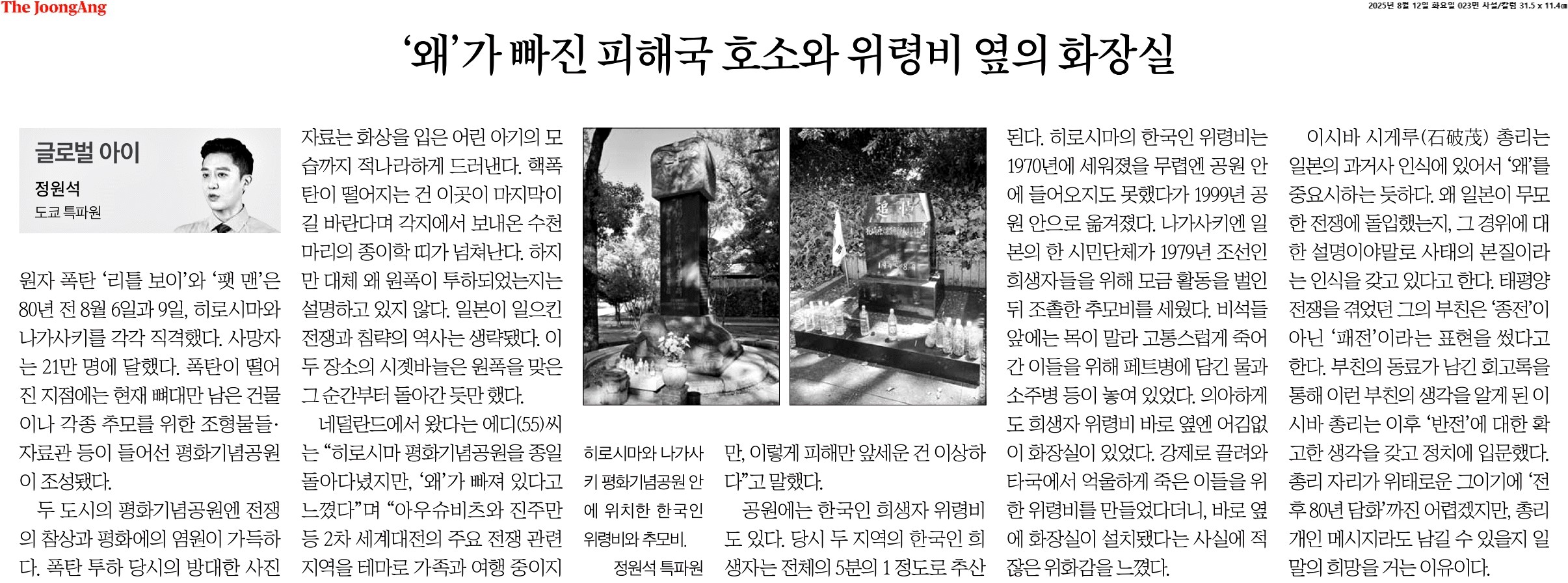 ⑤ 이시바 시게루(石破茂) 총리는 일본의 과거사 인식에 있어서 ‘왜’를 중요시하는 듯하다. 왜 일본이 무모한 전쟁에 돌입했는지, 그 경위에 대한 설명이야말로 사태의 본질이라는 인식을 갖고 있다고 한다. 태평양 전쟁을 겪었던 그의 부친은 ‘종전’이 아닌 ‘패전’이라는 표현을 썼다고 한다. 부친의 동료가 남긴 회고록을 통해 이런 부친의 생각을 알게 된 이시바 총리는 이후 ‘반전’에 대한 확고한 생각을 갖고 정치에 입문했다. 총리 자리가 위태로운 그이기에 ‘전후 80년 담화’까진 어렵겠지만, 총리 개인 메시지라도 남길 수 있을지 일말의 희망을 거는 이유이다.