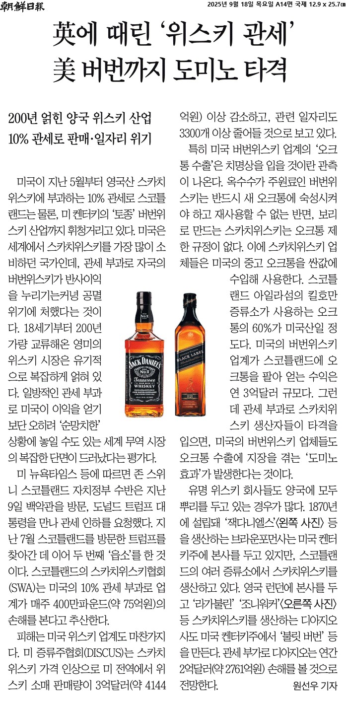 ① 미국이 지난 5월부터 영국산 스카치위스키에 부과하는 10% 관세로 스코틀랜드는 물론, 미 켄터키의 ‘토종’ 버번위스키 산업까지 휘청거리고 있다. 미국은 세계에서 스카치위스키를 가장 많이 소비하던 국가인데, 관세 부과로 자국의 버번위스키가 반사이익을 누리기는커녕 공멸 위기에 처했다는 것이다.