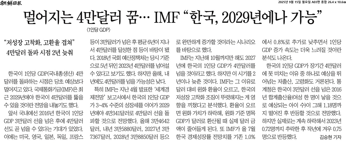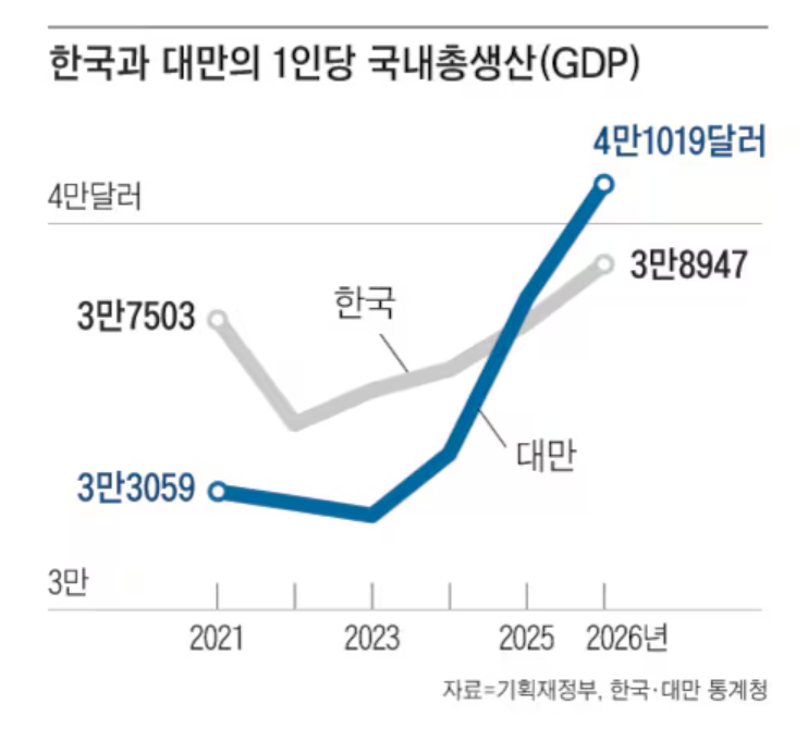 ② 14일 정부와 대만 통계청 자료를 토대로 두 나라의 성장률 전망치와 인구 추계 자료 등을 분석한 결과에 따르면, 올해 우리나라와 대만의 1인당 GDP는 각각 3만7430달러, 3만8066달러를 기록할 것으로 보인다. 우리나라의 1인당 GDP가 대만에 뒤처진 것은 2003년 이후 22년 만의 일이다. 대만 통계청은 내년 대만의 1인당 GDP가 4만1019달러를 기록하며 사상 처음 4만달러 선을 돌파할 것으로 예상하고 있다.