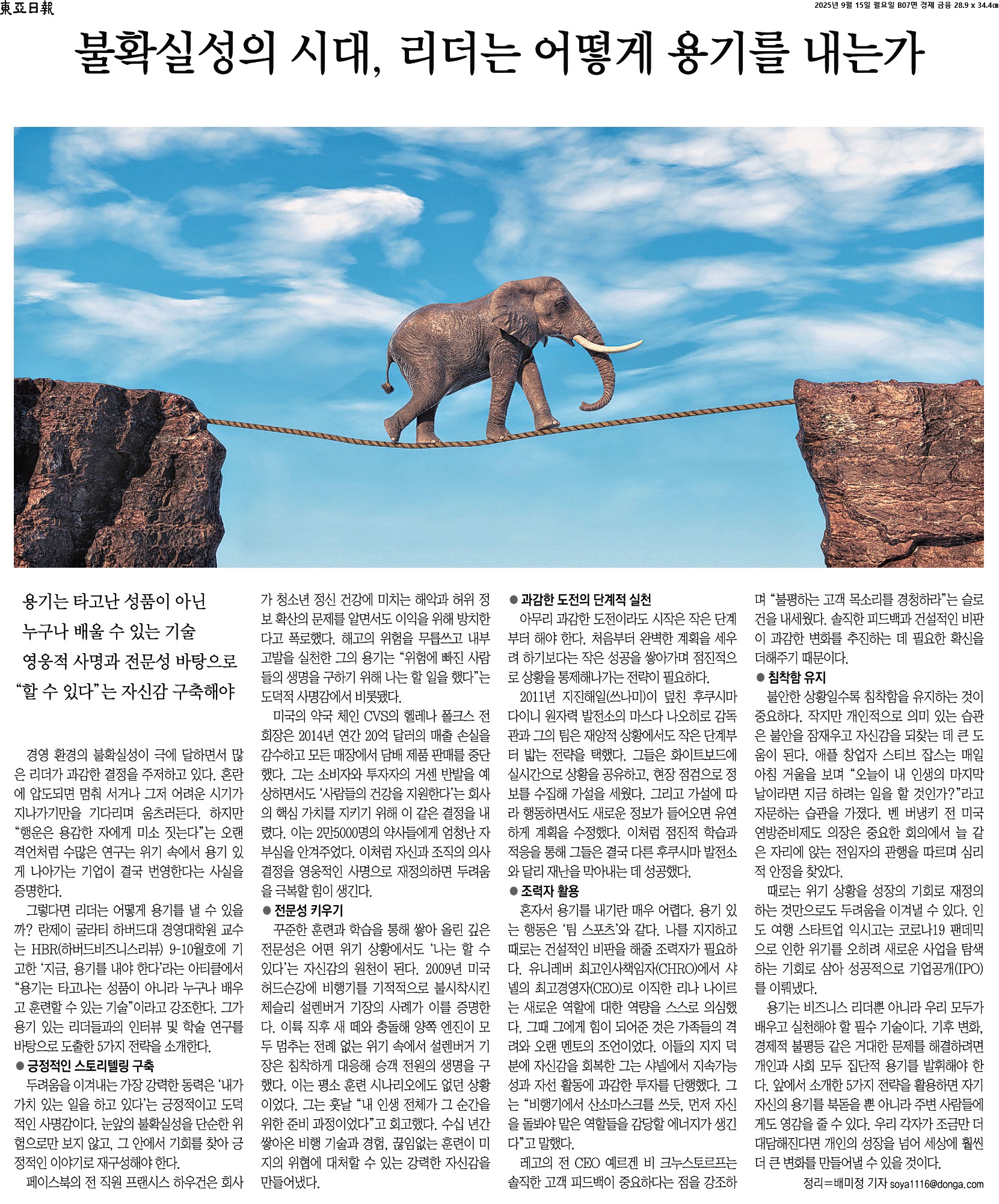 ① 경영 환경의 불확실성이 극에 달하면서 많은 리더가 과감한 결정을 주저하고 있다. 혼란에 압도되면 멈춰 서거나 그저 어려운 시기가 지나가기만을 기다리며 움츠러든다. 하지만 “행운은 용감한 자에게 미소 짓는다”는 오랜 격언처럼 수많은 연구는 위기 속에서 용기 있게 나아가는 기업이 결국 번영한다는 사실을 증명한다.
