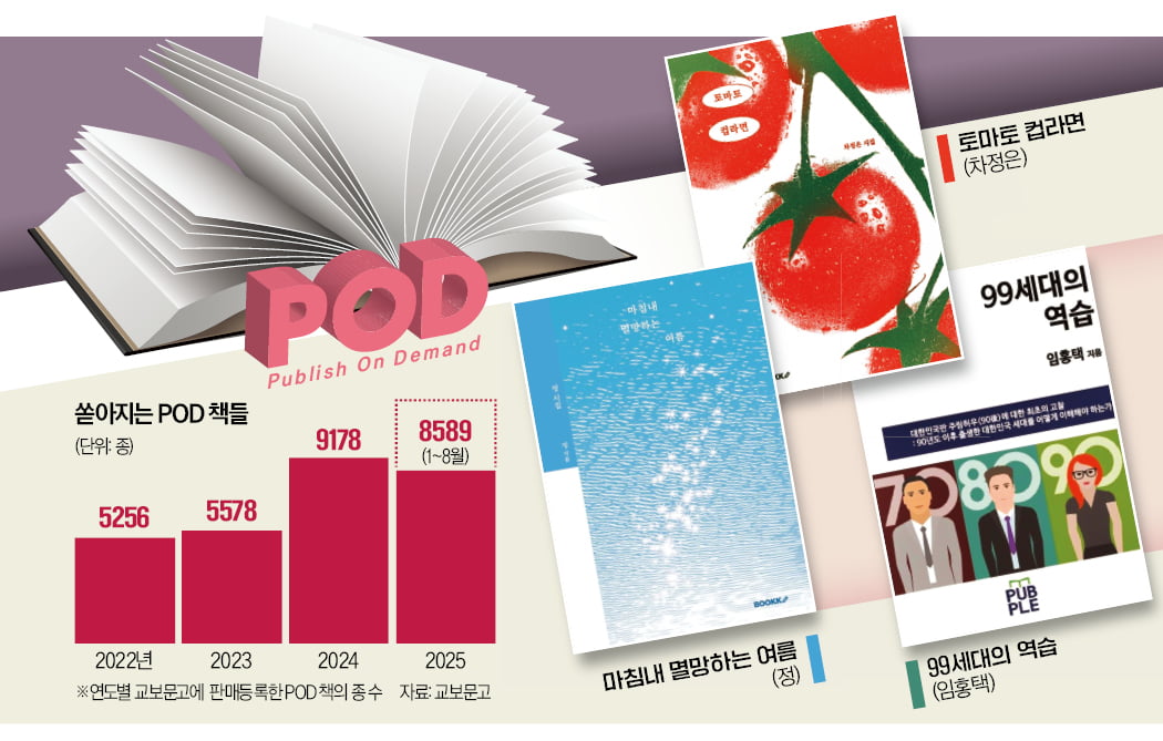 ② 차 작가처럼 출판사 문을 두드리는 대신 POD 출판을 택하는 작가 지망생이 늘고 있다. 15일 교보문고에 따르면 이 서점에 판매 등록된 POD 서적은 2023년 5578종에서 2024년 9178종으로 증가했다. 올해는 8월까지만 8589종을 기록해 1만 종을 넘어설 가능성이 높다. 교보문고 관계자는 “자사 POD 서비스 ‘바로출판’을 이용해 책을 출간한 작가가 올 8월 기준으로 작년 전체보다 18.2% 늘어 시장이 급성장 중”이라고 설명했다.