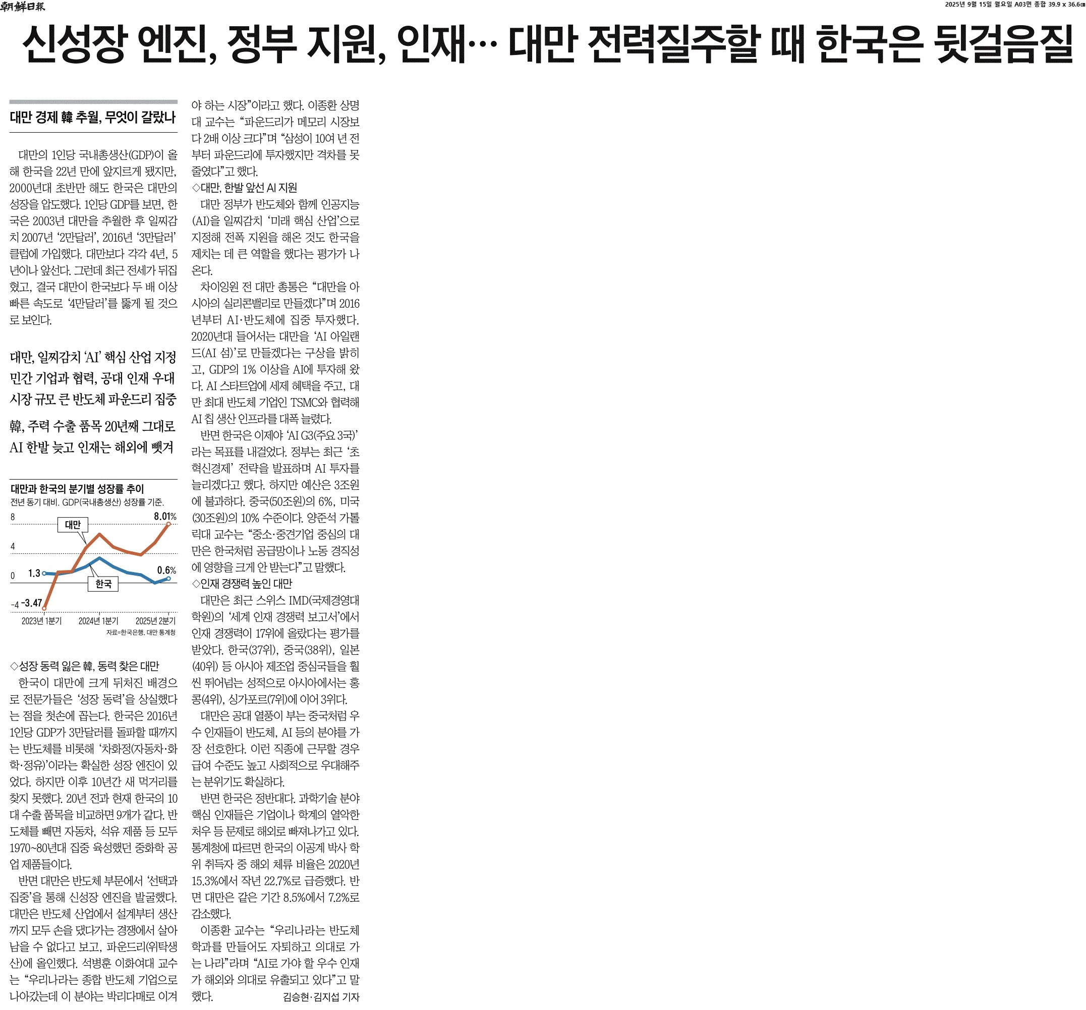 ④ 대만 정부가 반도체와 함께 인공지능(AI)을 일찌감치 ‘미래 핵심 산업’으로 지정해 전폭 지원을 해온 것도 한국을 제치는 데 큰 역할을 했다는 평가가 나온다. 차이잉원 전 대만 총통은 “대만을 아시아의 실리콘밸리로 만들겠다”며 2016년부터 AI·반도체에 집중 투자했다. 2020년대 들어서는 대만을 ‘AI 아일랜드(AI 섬)’로 만들겠다는 구상을 밝히고, GDP의 1% 이상을 AI에 투자해 왔다.