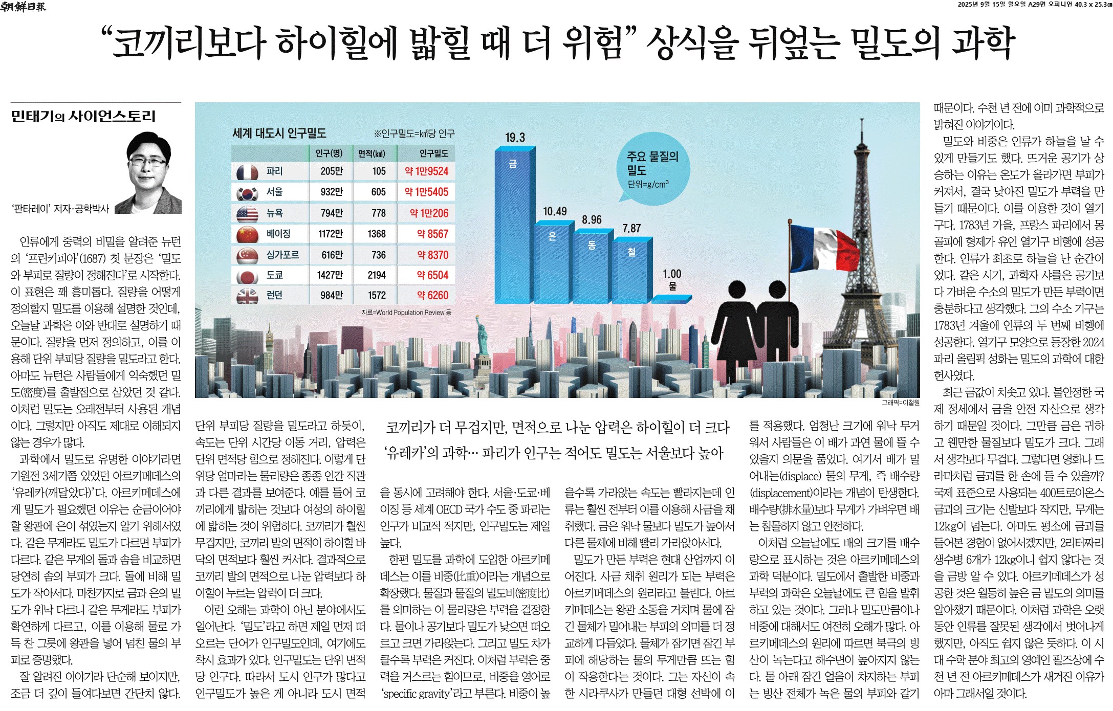 ② 과학에서 밀도로 유명한 이야기라면 기원전 3세기쯤 있었던 아르키메데스의 ‘유레카’(깨달았다)다. 아르키메데스에게 밀도가 필요했던 이유는 순금이어야 할 왕관에 은이 섞였는지 알기 위해서였다. 같은 무게라도 밀도가 다르면 부피가 다르다.