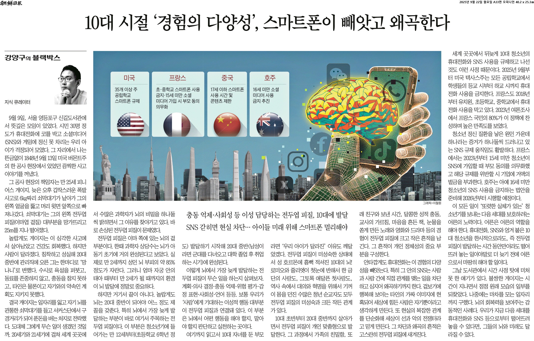 ⑤ 안타깝게도 휴대전화는 이 경험의 다양성을 빼앗는다. 특히 그 안의 SNS는 사람과 사람 간에 직접 관계를 맺는 일을 차단하고 심지어 왜곡하기까지 한다. 겉보기에 행복해 보이는 타인의 가짜 이미지에 현혹되어 세상에 힘든 사람은 자기뿐이라고 생각하게 만든다. 또 현실의 복잡한 관계를 단순화해 세상이 선과 악의 전쟁터라고 믿게 만든다. 그 차단과 왜곡의 흔적은 고스란히 전두엽 피질에 새겨진다.
