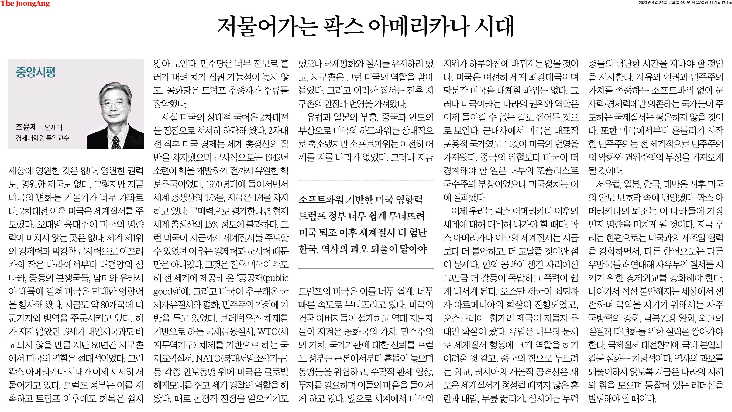 ④ 유럽과 일본의 부흥, 중국과 인도의 부상으로 미국의 하드파워는 상대적으로 축소됐지만 소프트파워는 여전히 어깨를 겨룰 나라가 없었다. 그러나 지금 트럼프의 미국은 이를 너무 쉽게, 너무 빠른 속도로 무너뜨리고 있다. 미국의 건국 아버지들이 설계하고 역대 지도자들이 지켜온 공화국의 가치, 민주주의의 가치, 국가기관에 대한 신뢰를 트럼프 정부는 근본에서부터 흔들어 놓으며 동맹들을 위협하고, 수탈적 관세 협상, 투자를 강요하며 이들의 마음을 돌아서게 하고 있다. 앞으로 세계에서 미국의 지위가 하루아침에 바뀌지는 않을 것이다. 미국은 여전히 세계 최강대국이며 당분간 미국을 대체할 파워는 없다. 그러나 미국이라는 나라의 권위와 역할은 이제 돌이킬 수 없는 길로 접어든 것으로 보인다.