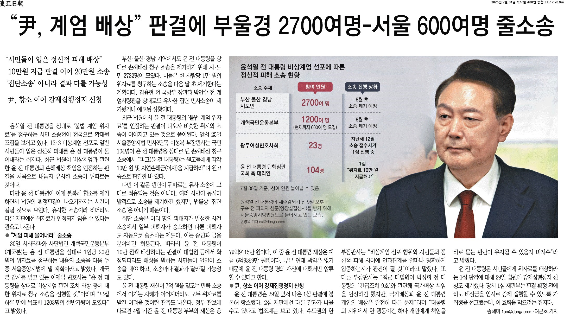 ② 최근 법원에서 윤 전 대통령의 ‘불법 계엄 위자료’를 인정하는 판결이 나오자 비슷한 취지의 소송이 이어지고 있는 것으로 풀이된다. 앞서 25일 서울중앙지법 민사2단독 이성복 부장판사는 국민 104명이 윤 전 대통령을 상대로 낸 손해배상 청구소송에서 “피고(윤 전 대통령)는 원고들에게 각각 10만 원 및 지연손해금(이자)을 지급하라”며 원고 승소로 판결한 바 있다.