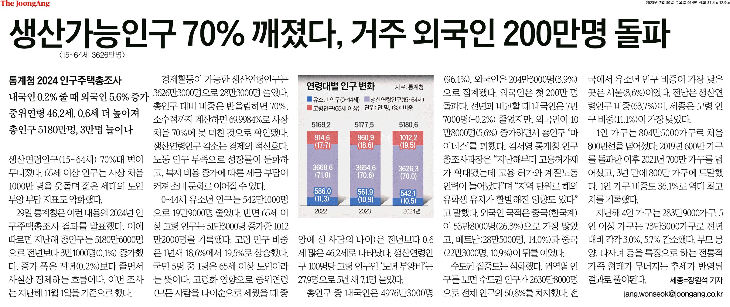 경제활동이 가능한 생산연령인구는 3626만3000명으로 28만3000명 줄었다. 총인구 대비 비중은 반올림하면 70%, 소수점까지 계산하면 69.9984%로 사상 처음 70%에 못 미친 것으로 확인됐다. 생산연령인구 감소는 경제의 적신호다. 노동 인구 부족으로 성장률이 둔화하고, 복지 비용 증가에 따른 세금 부담이 커져 소비 둔화로 이어질 수 있다.
