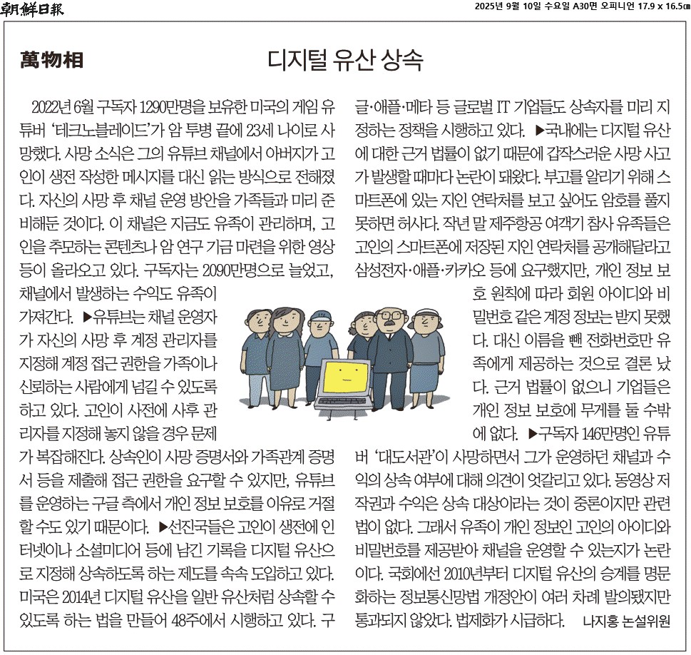 ⑤ 구독자 146만명인 유튜버 ‘대도서관’이 사망하면서 그가 운영하던 채널과 수익의 상속 여부에 대해 의견이 엇갈리고 있다. 동영상 저작권과 수익은 상속 대상이라는 것이 중론이지만 관련 법이 없다. 그래서 유족이 개인 정보인 고인의 아이디와 비밀번호를 제공받아 채널을 운영할 수 있는지가 논란이다. 국회에선 2010년부터 디지털 유산의 승계를 명문화하는 정보통신망법 개정안이 여러 차례 발의됐지만 통과되지 않았다. 법제화가 시급하다.
