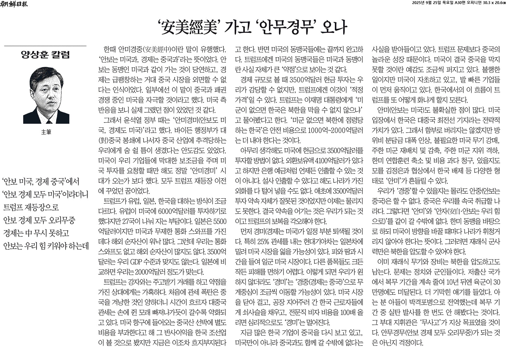 ① 한때 안미경중(安美經中)이란 말이 유행했다. ‘안보는 미국과, 경제는 중국과’라는 뜻이었다. 안보는 동맹인 미국과 같이 가는 것이 당연하고, 경제는 급팽창하는 거대 중국 시장을 외면할 수 없다는 인식이었다. 일부에선 이 말이 중국과 패권 경쟁 중인 미국을 자극할 것이라고 했다. 미국 측 반응을 보니 실제 그랬던 점이 있었던 것 같다.