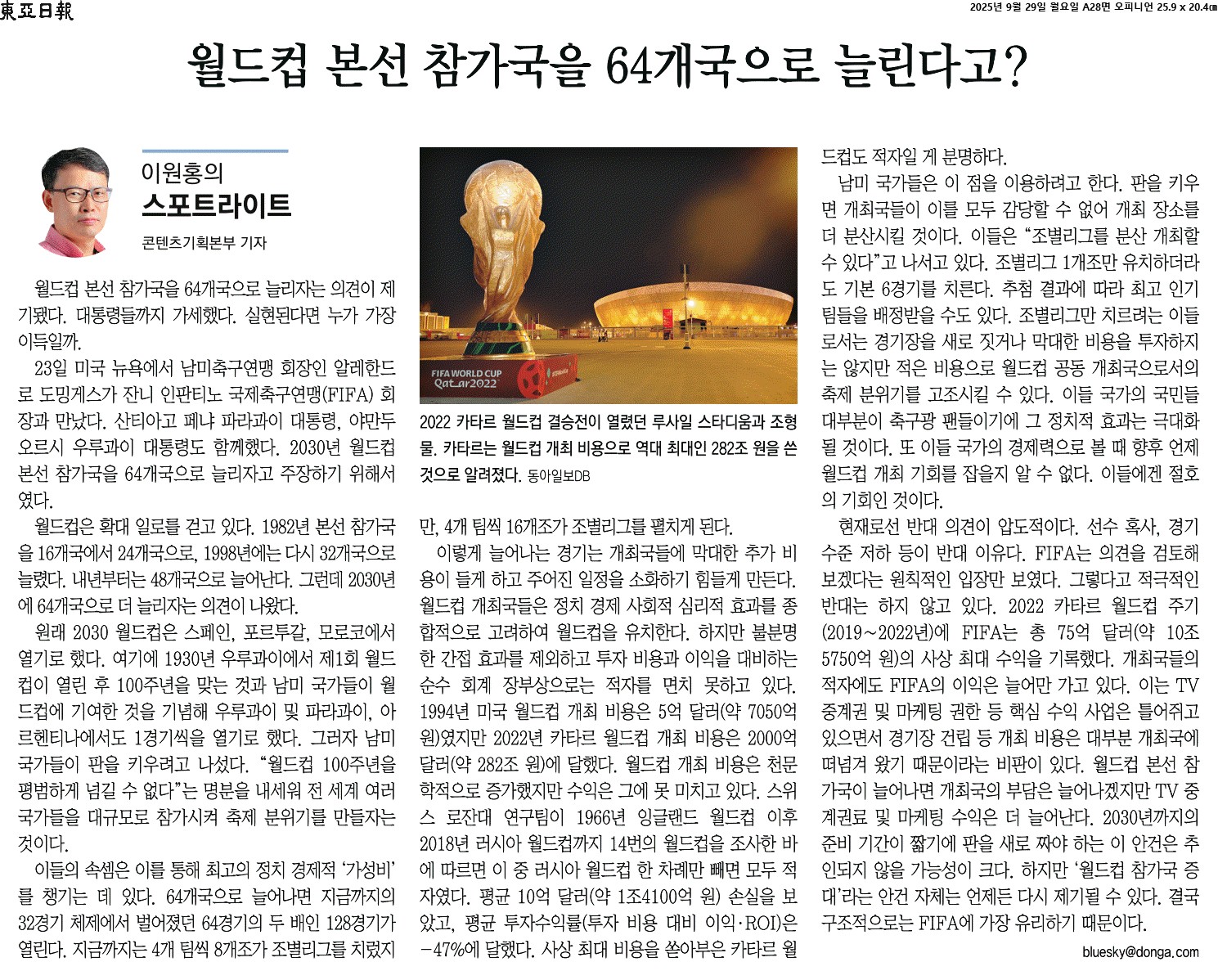 ① 월드컵은 확대 일로를 걷고 있다. 1982년 본선 참가국을 16개국에서 24개국으로, 1998년에는 다시 32개국으로 늘렸다. 내년부터는 48개국으로 늘어난다. 그런데 2030년에 64개국으로 더 늘리자는 의견이 나왔다.