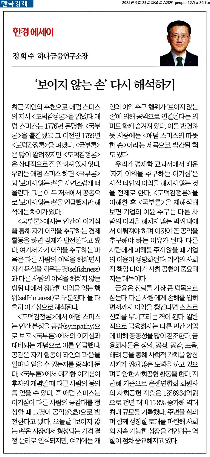 ① 최근 지인의 추천으로 애덤 스미스의 저서 <도덕감정론>을 읽었다. 애덤 스미스는 1776년 유명한 <국부론>을 출간했고 그 이전인 1759년 <도덕감정론>을 펴냈다. <국부론>은 많이 알려졌지만 <도덕감정론>은 상대적으로 잘 알려져 있지 않다. 우리는 애덤 스미스 하면 <국부론>과 ‘보이지 않는 손’을 자연스럽게 떠올린다. 그는 이 두 저서에서 공통으로 ‘보이지 않는 손’을 언급했지만 해석에는 차이가 있다.